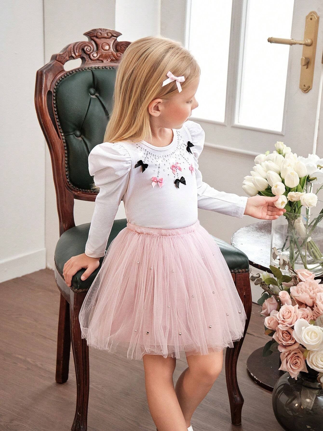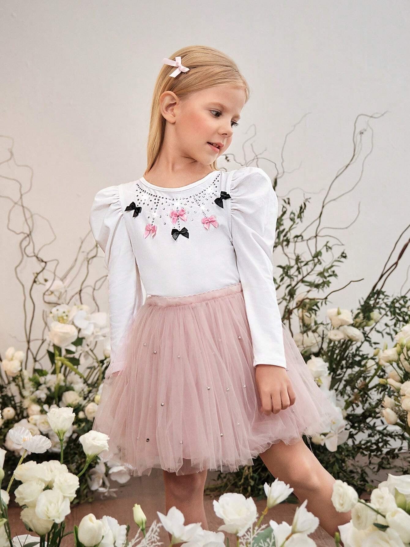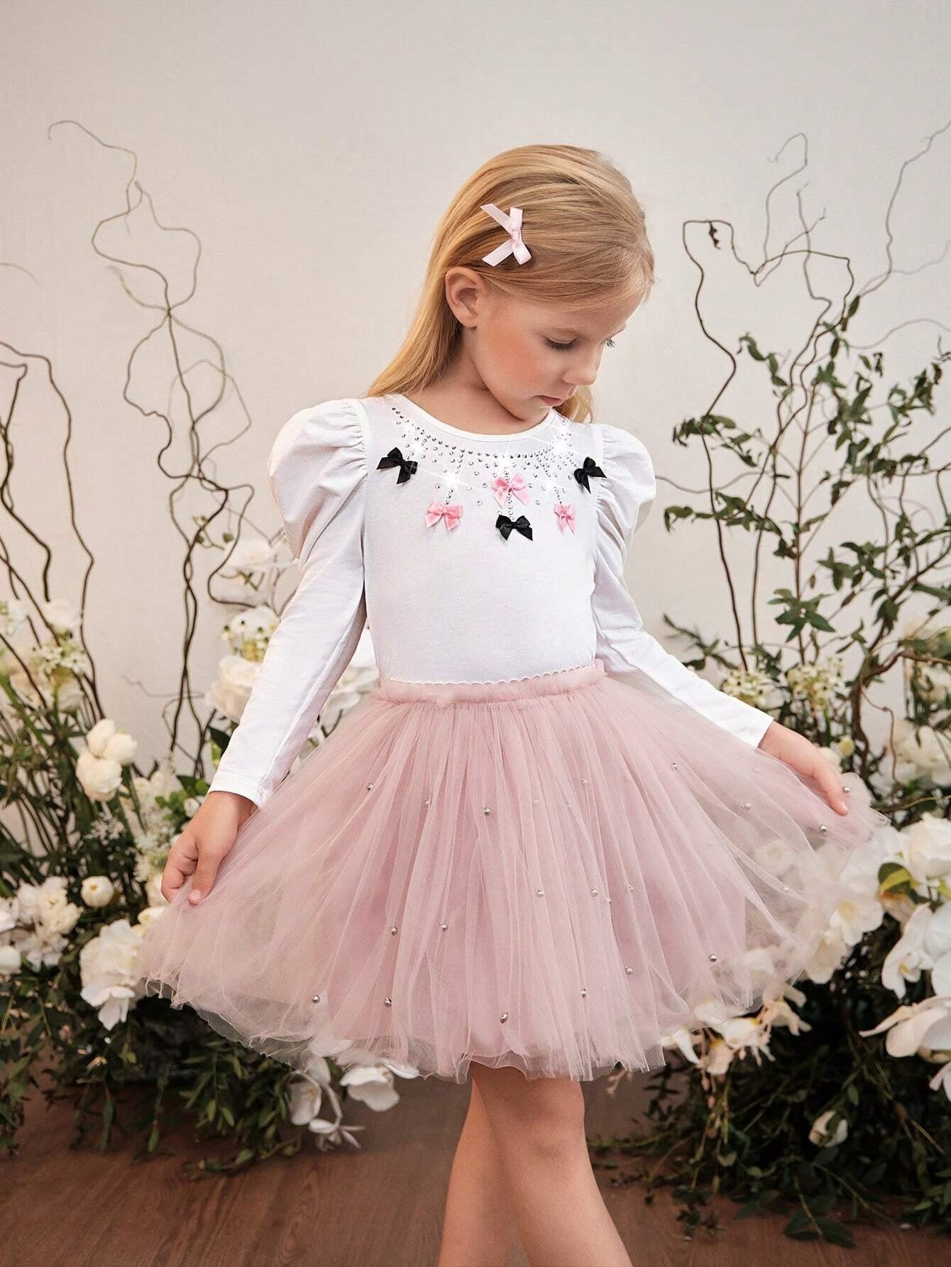 Esta blusa blanca de fiesta con lazos para niña combina dulzura y elegancia con detalles brillantes y mangas abombadas, ideal para ocasiones especiales.