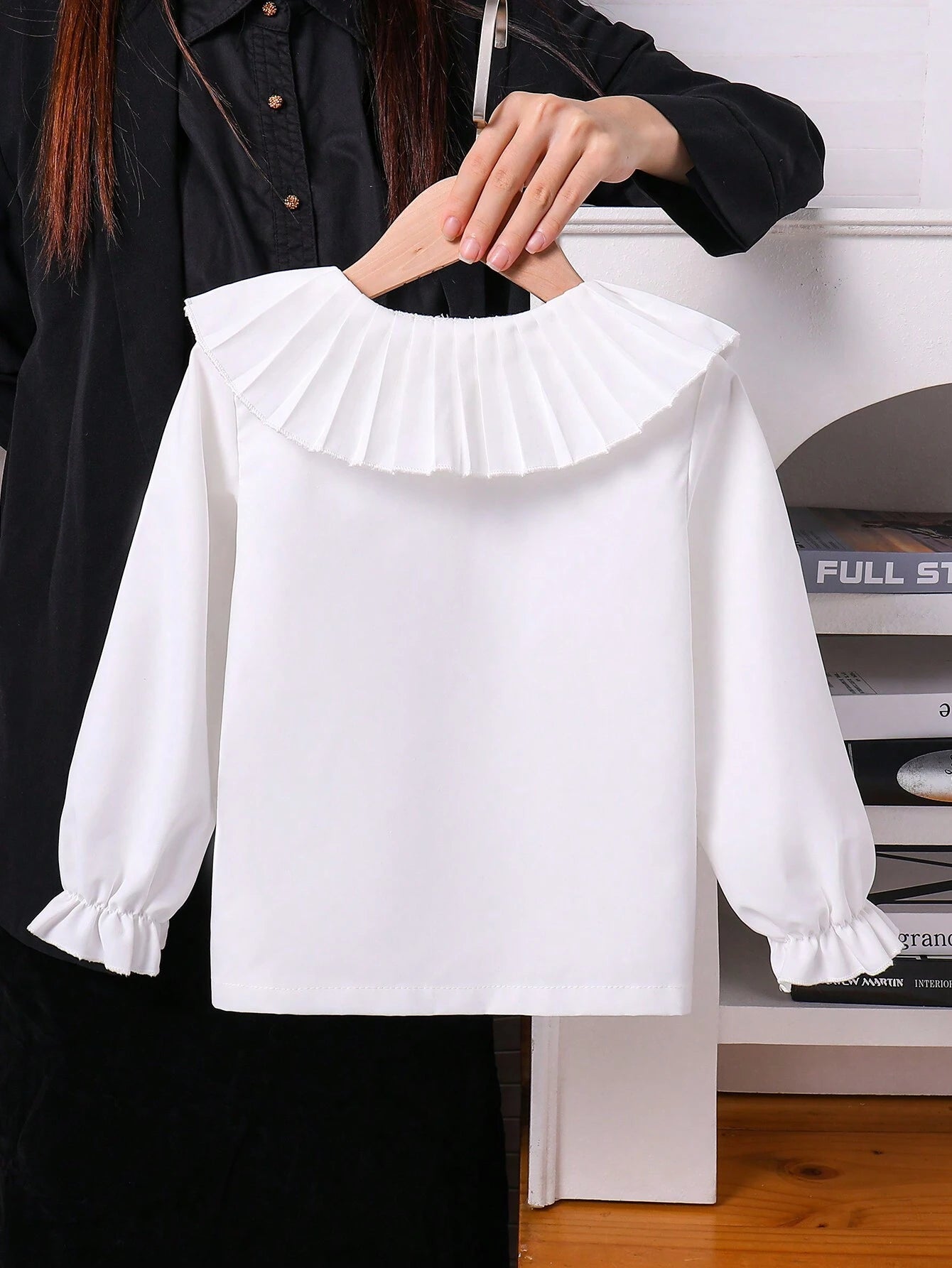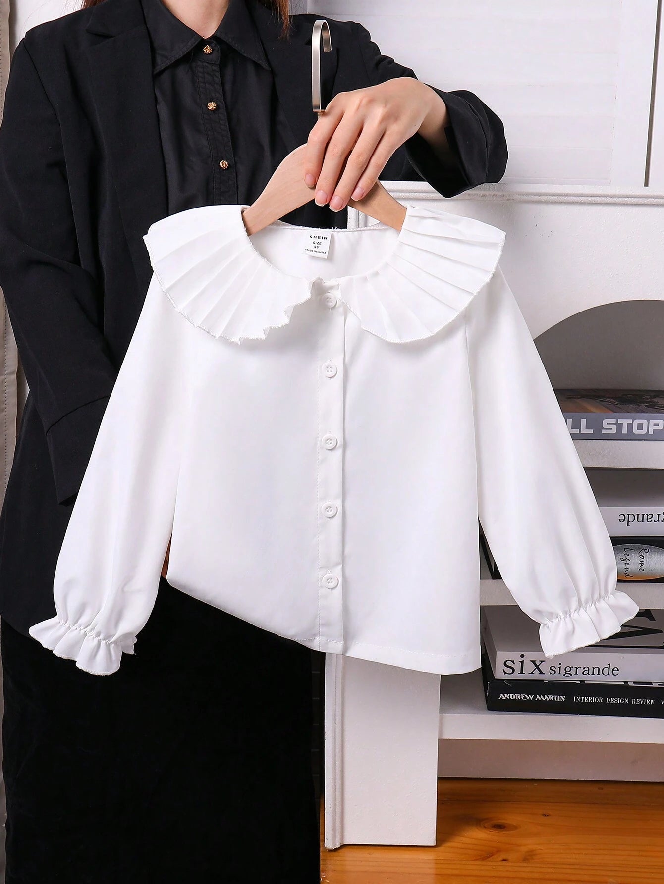 Una blusa blanca encantadora con cuello plisado y mangas abullonadas, perfecta para darle a tu pequeña un estilo sofisticado y dulce.