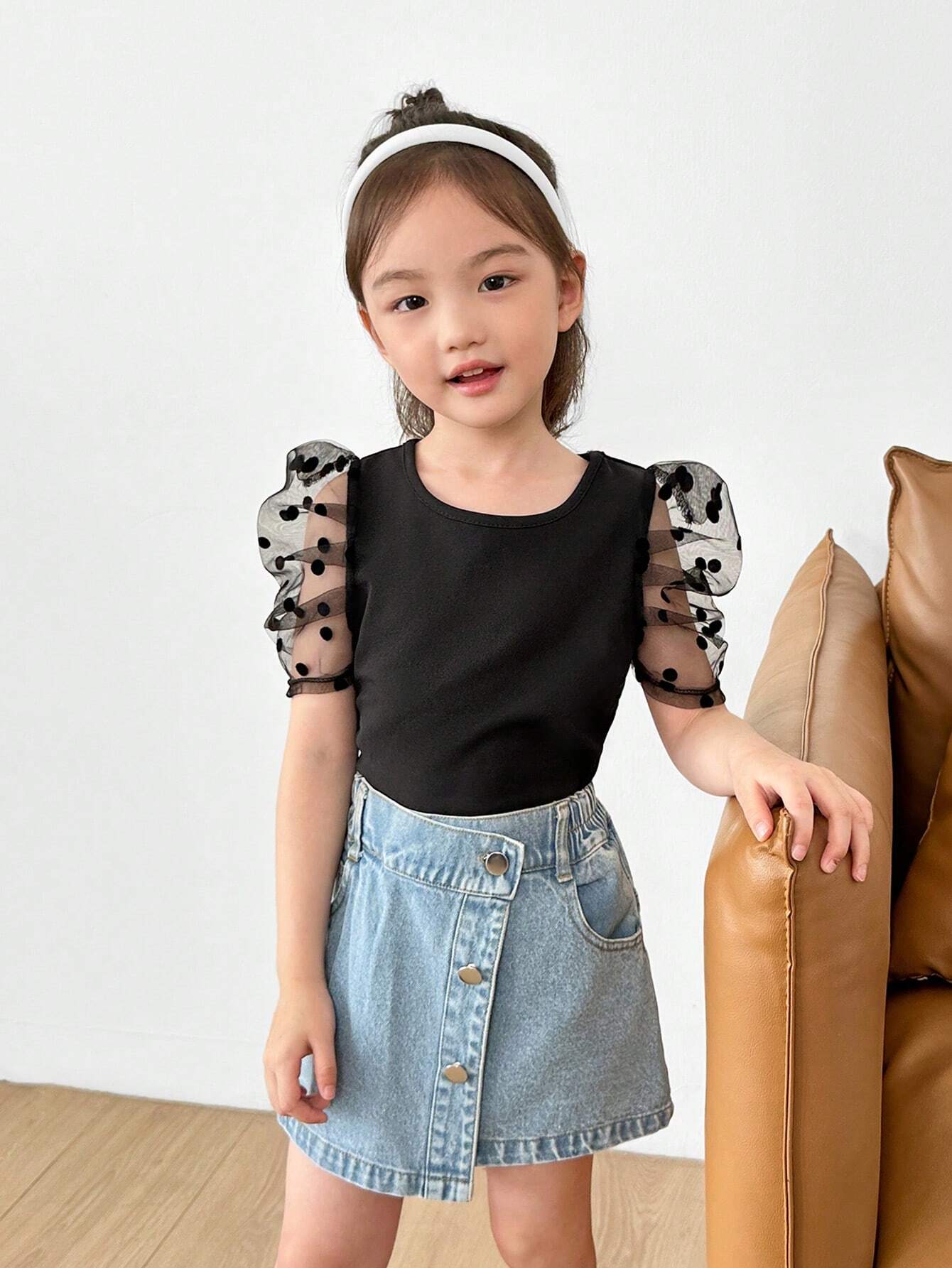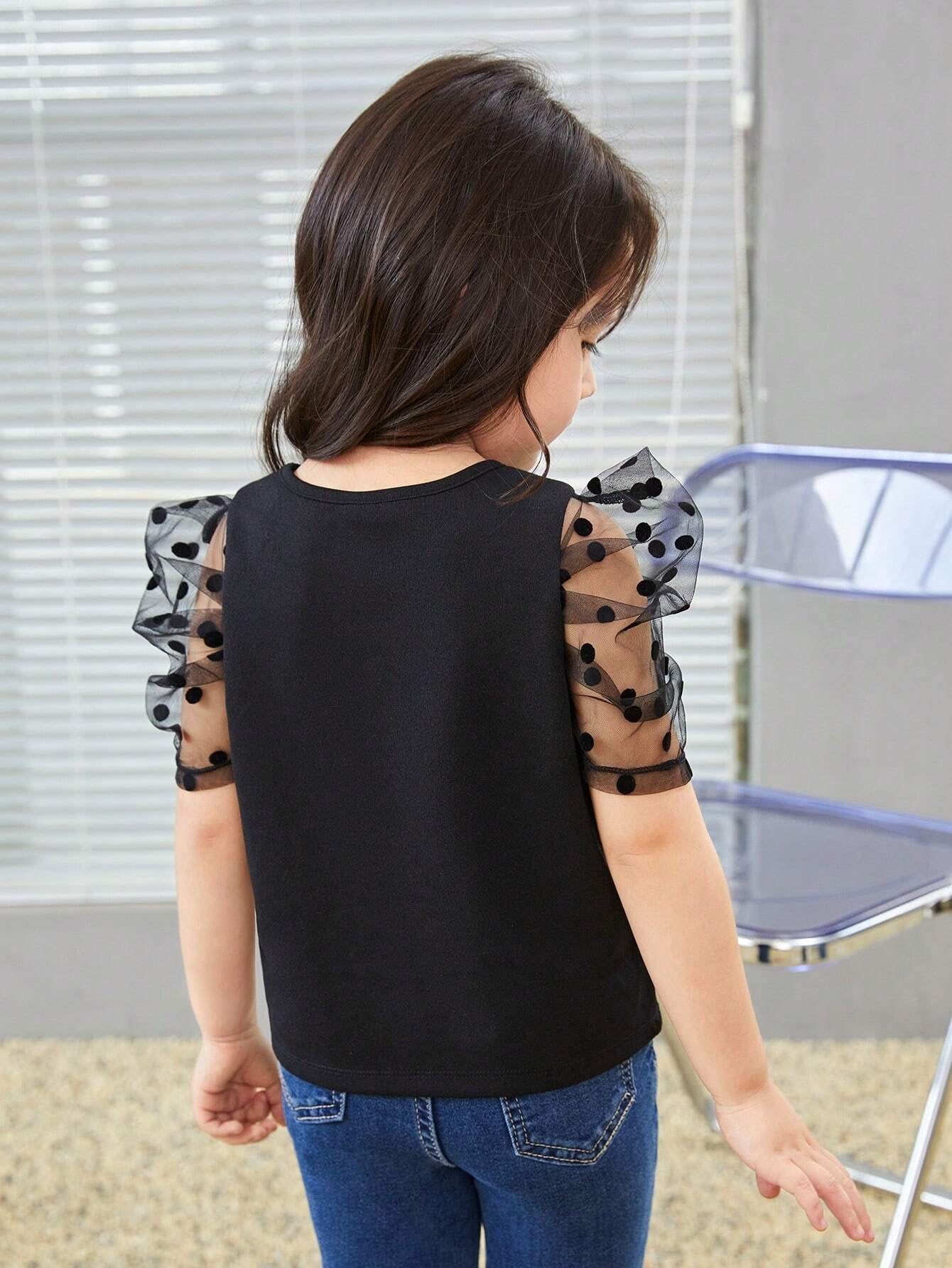 Blusa negra para niña con mangas de tul transparente decoradas con lunares, perfecta para un estilo moderno y cómodo.