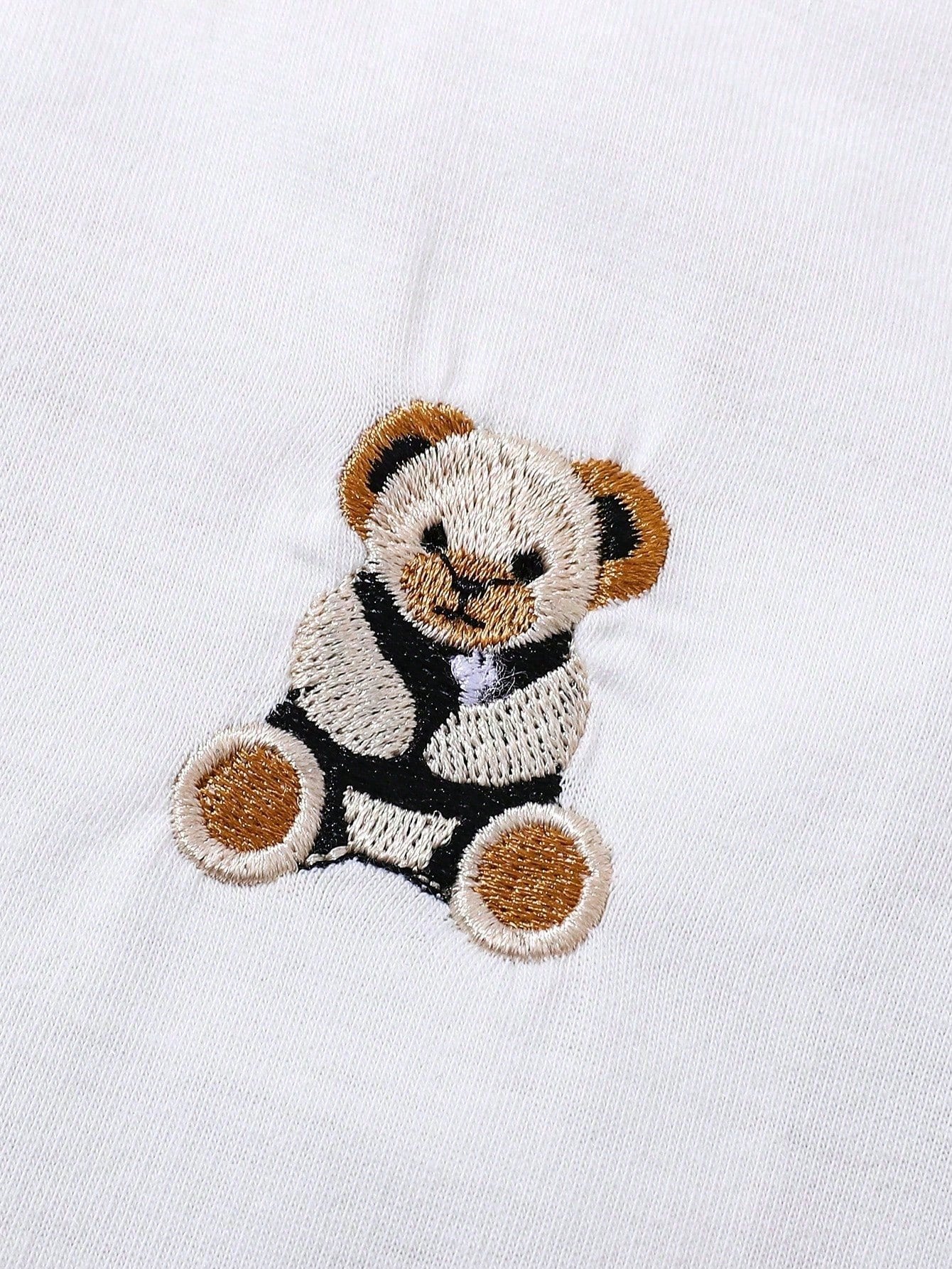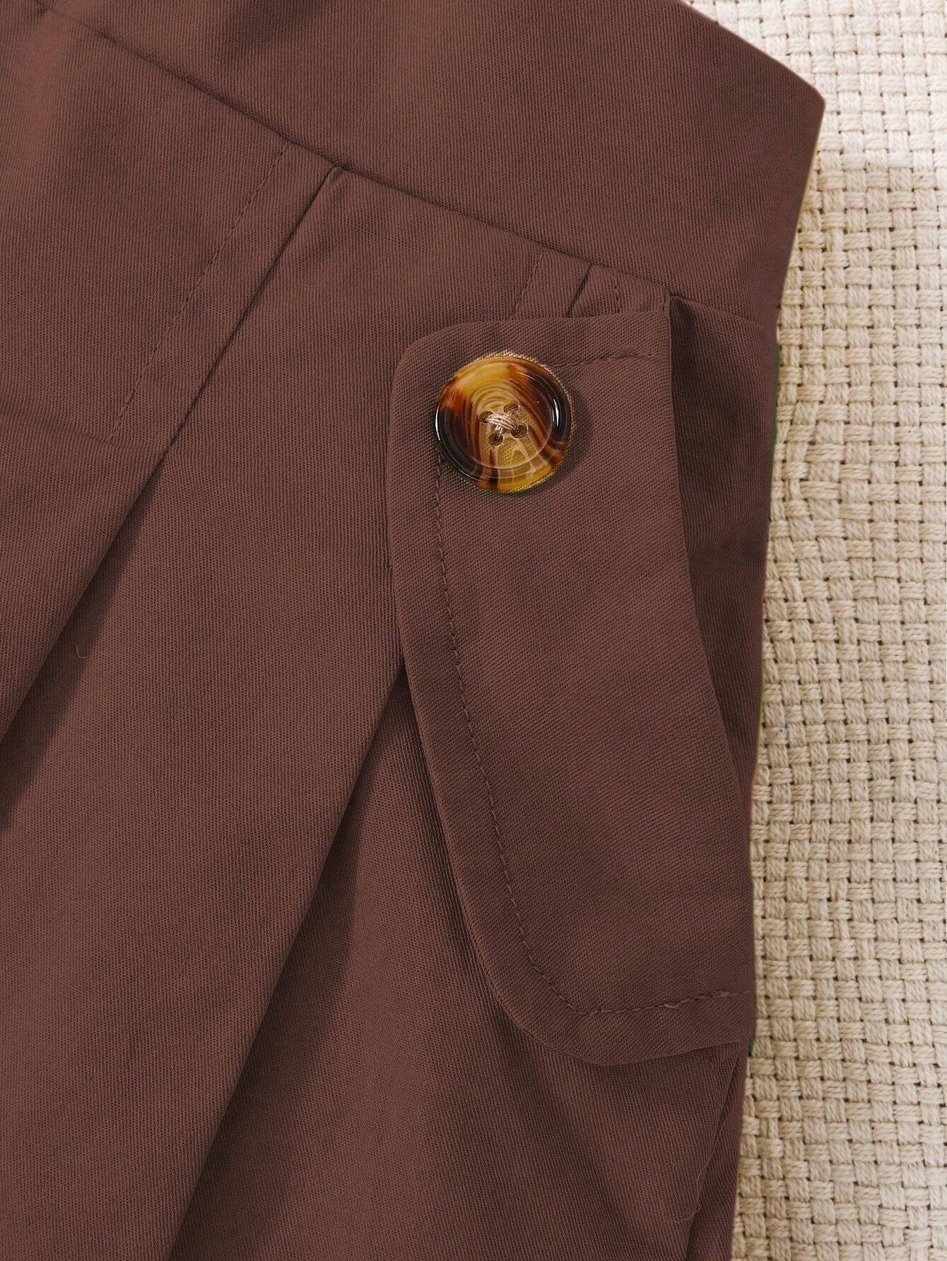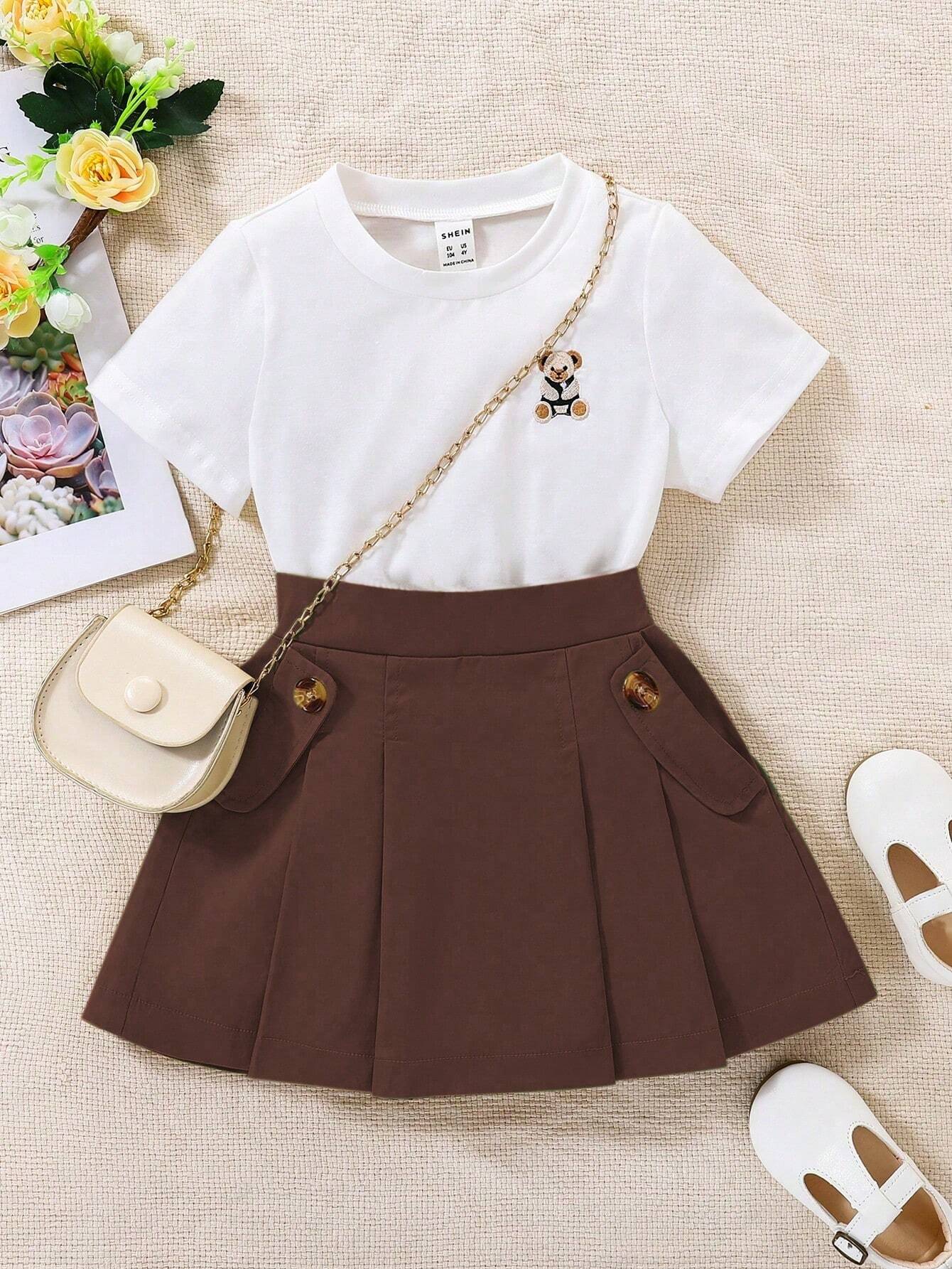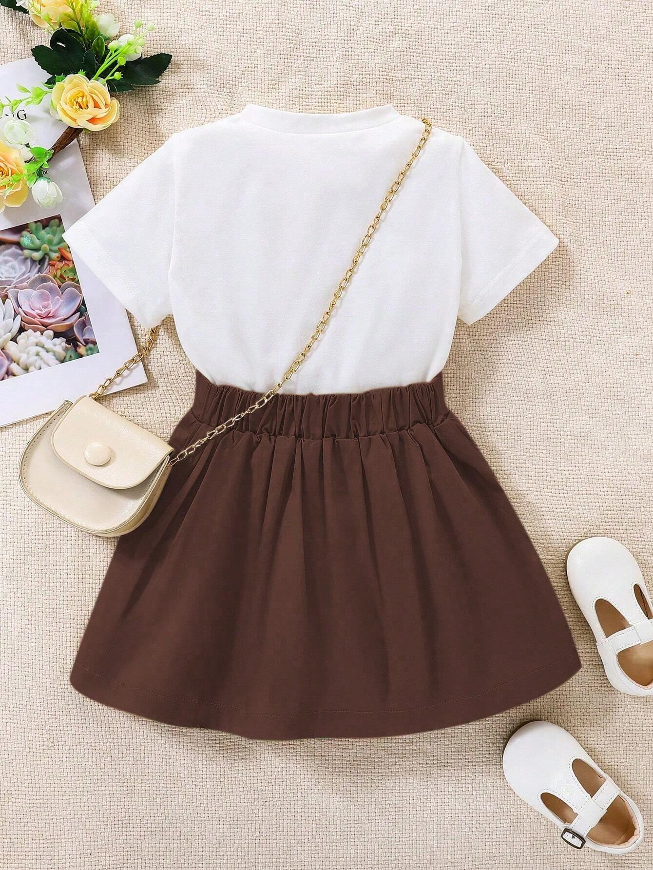 Conjunto De Blusa Blanca Con Bordado Y Falda Marrón Para Niña