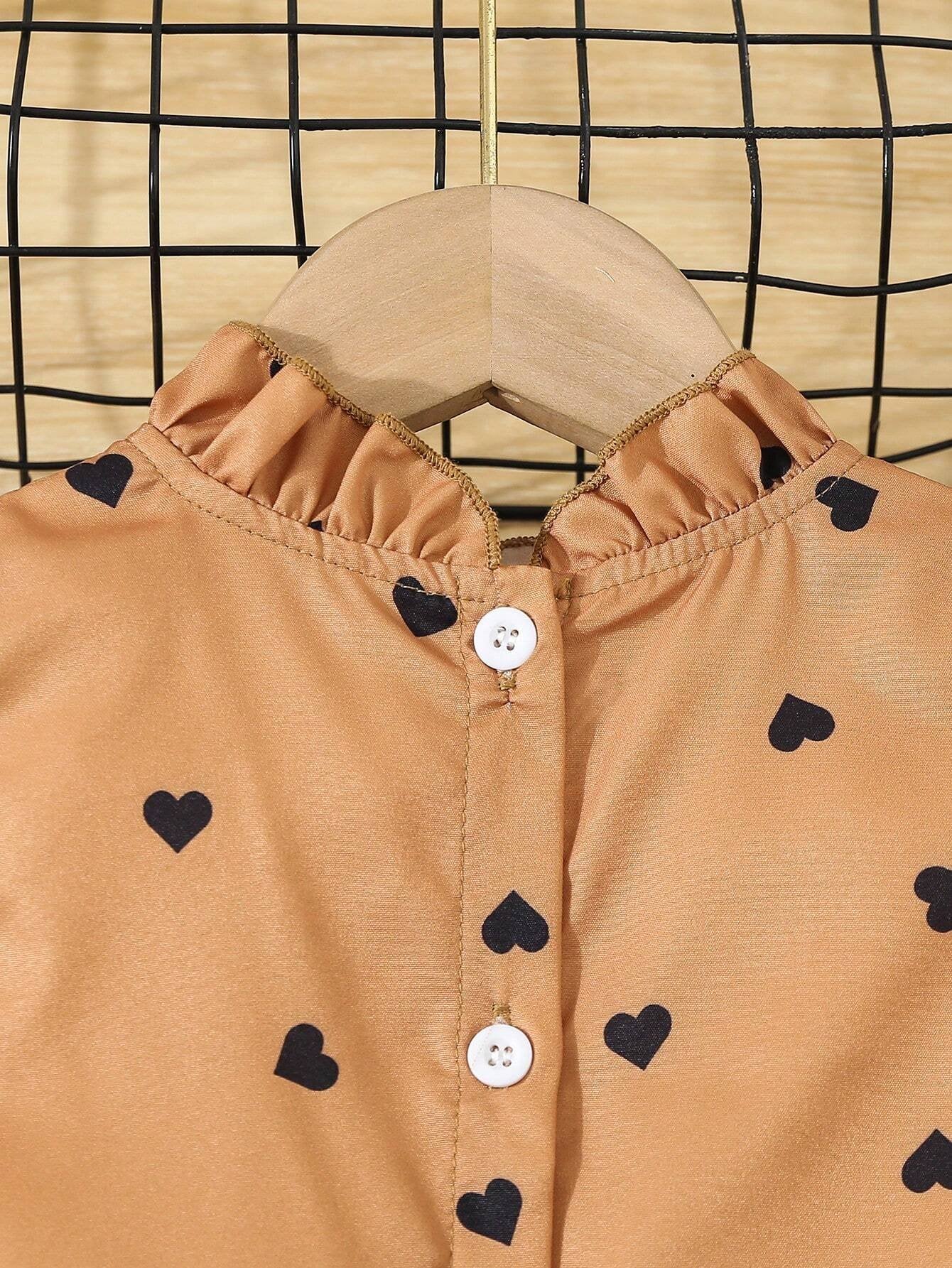 El Conjunto De Corazones Con Lazo Para Niña es una combinación encantadora de detalles delicados y estilo moderno. El top en tono camel está adornado con un alegre estampado de corazones negros que transmite ternura y diversión. El cuello fruncido y las mangas con volantes añaden un toque femenino y juguetón, mientras que el bajo asimétrico da un aire moderno y favorecedor a la silueta.