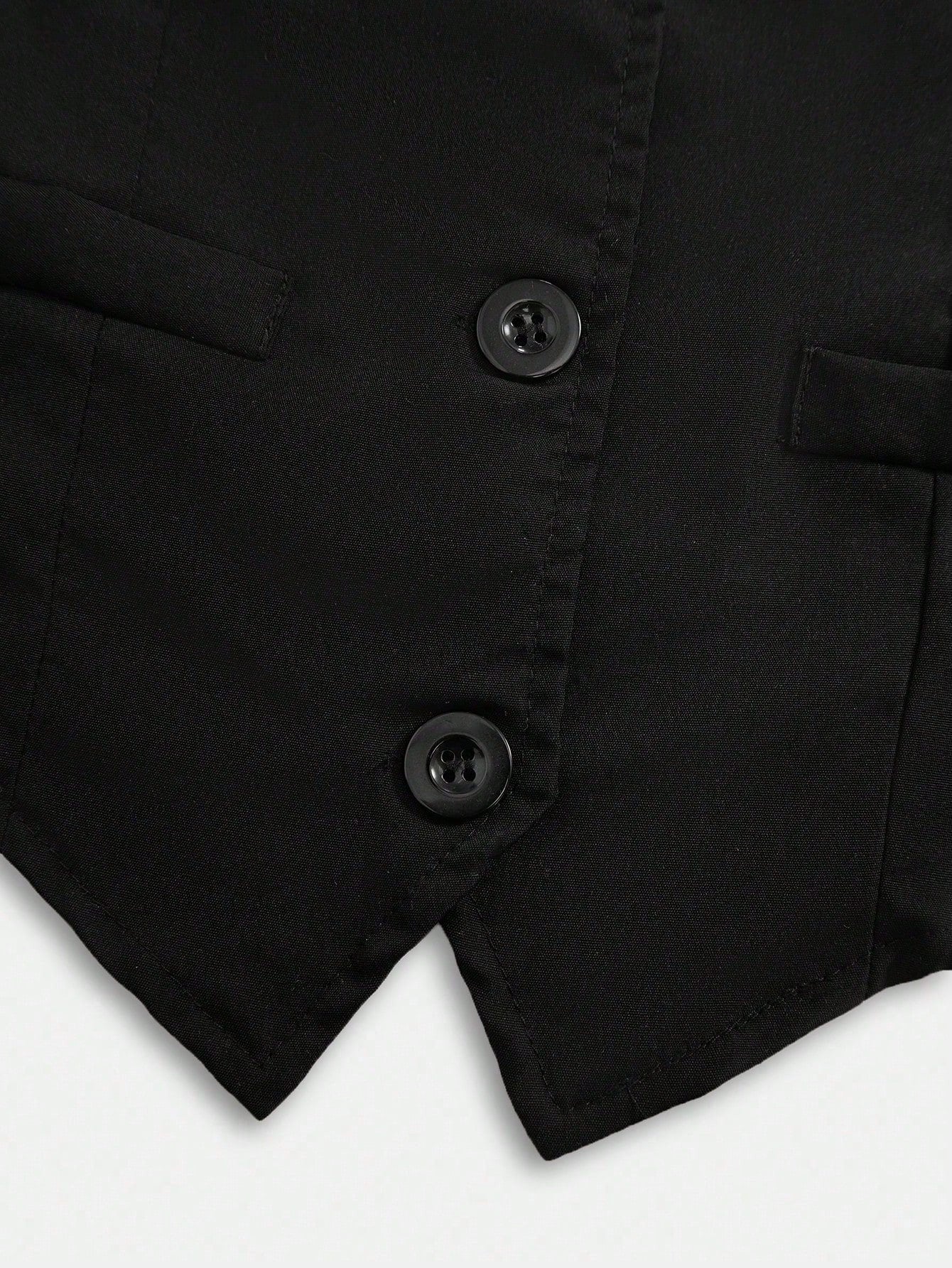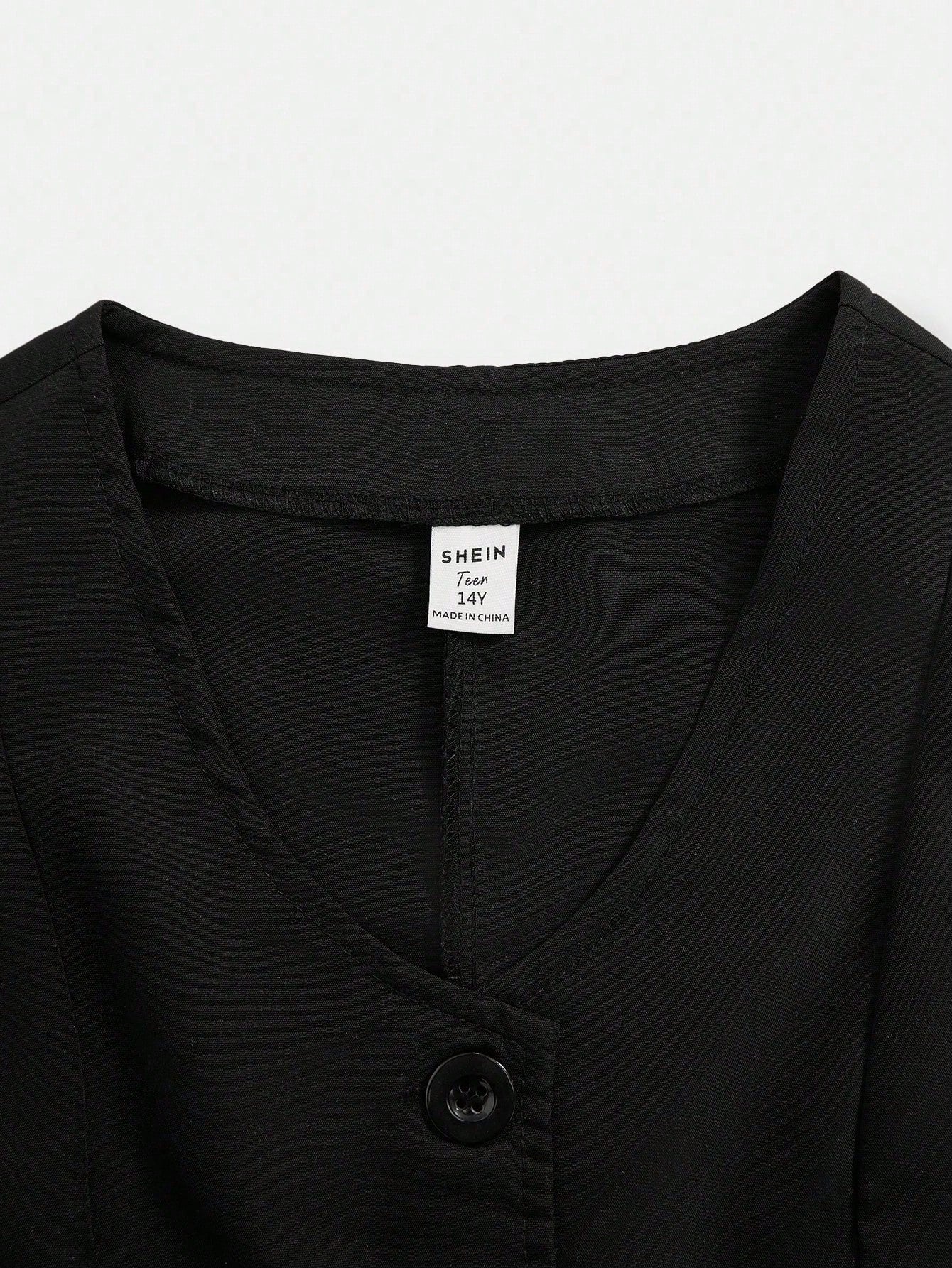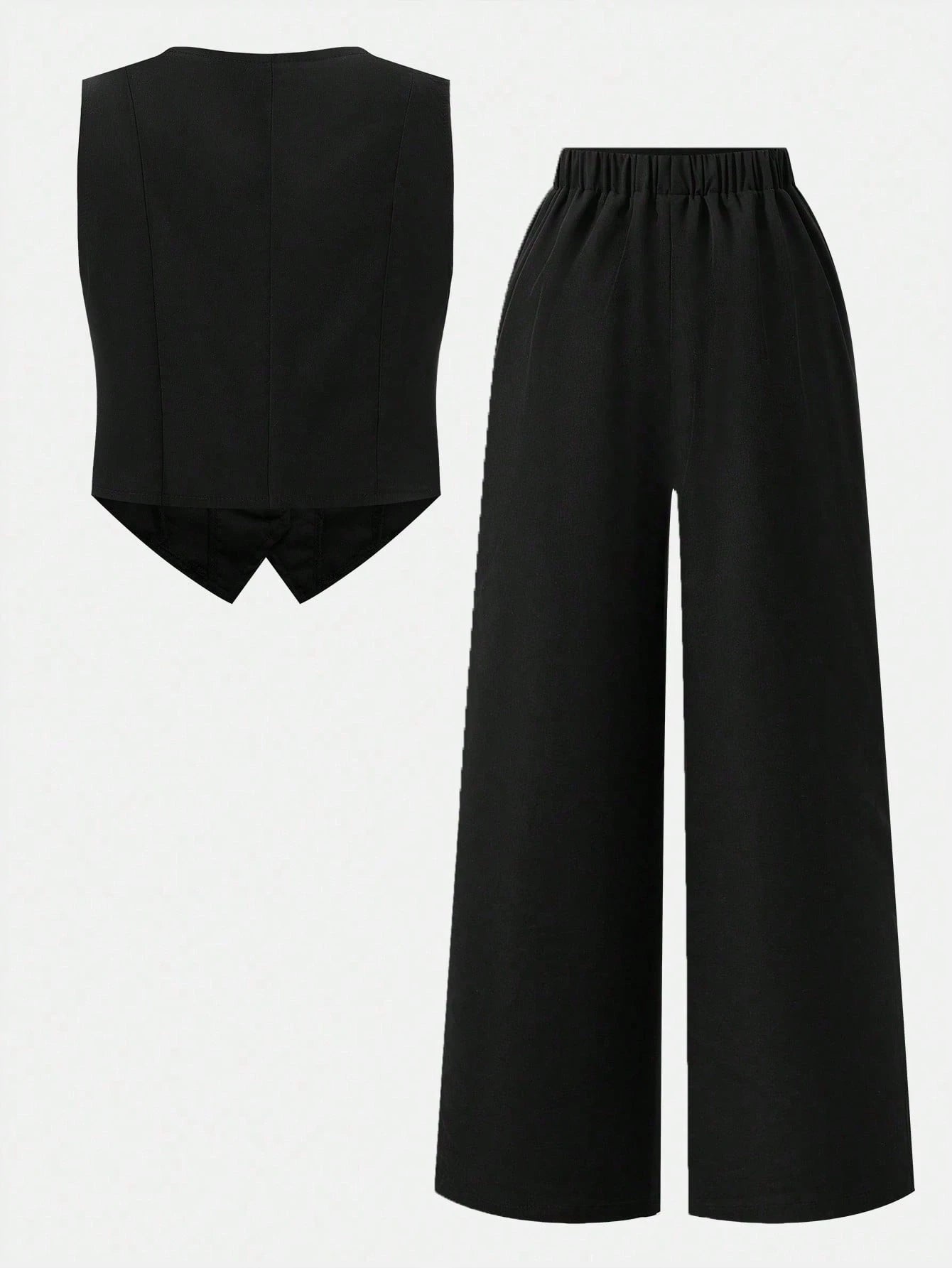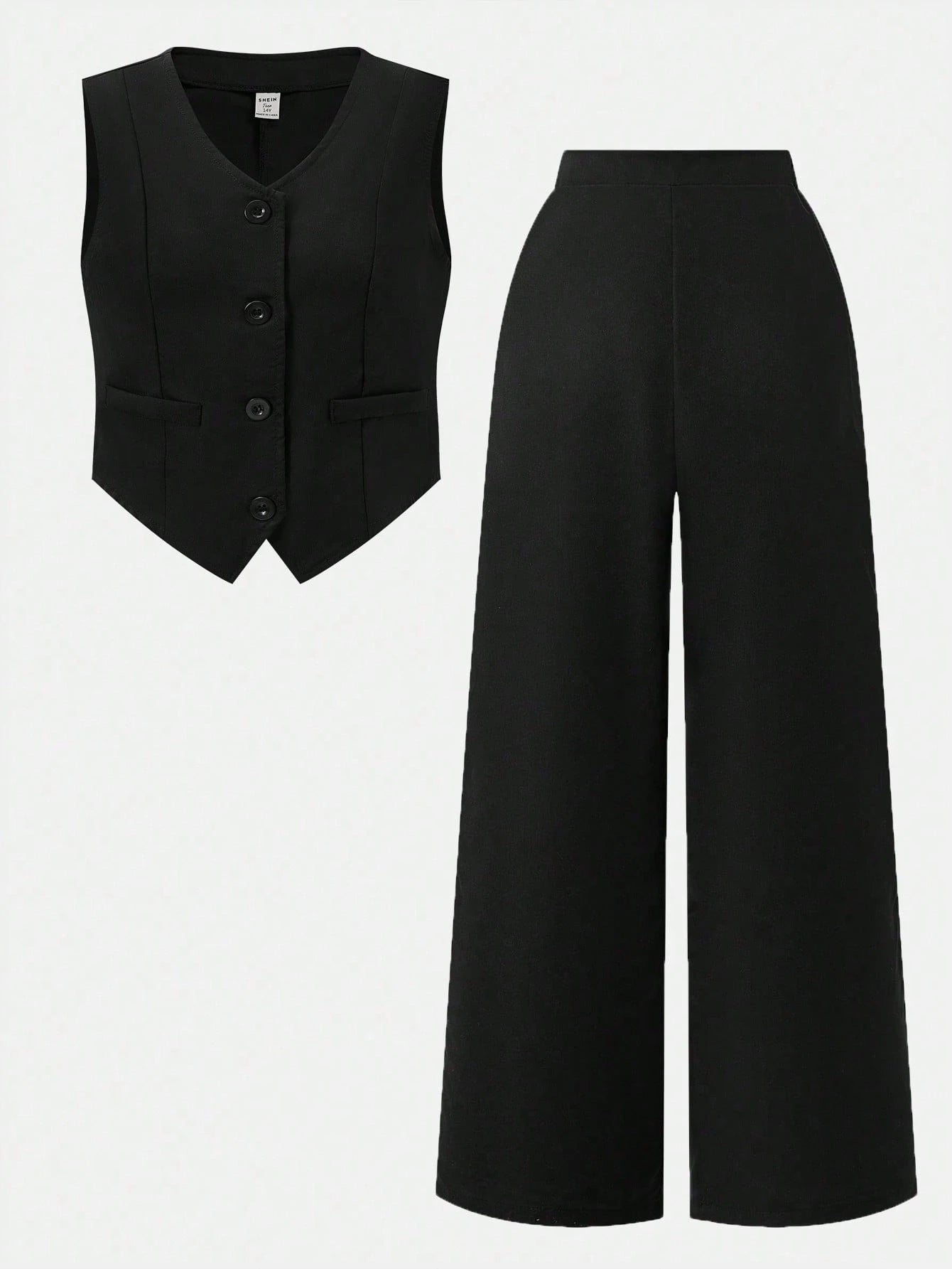 El Conjunto Negro Elegante para niña es la elección perfecta para quienes buscan un look moderno y refinado. Compuesto por un chaleco tipo blazer sin mangas y un pantalón largo de pierna ancha, este conjunto logra una silueta estilizada y sofisticada. El chaleco cuenta con cuello en “V” y cierre de botones delanteros, acompañado de bolsillos decorativos y un corte asimétrico en la parte baja que aporta un toque distintivo y actual.