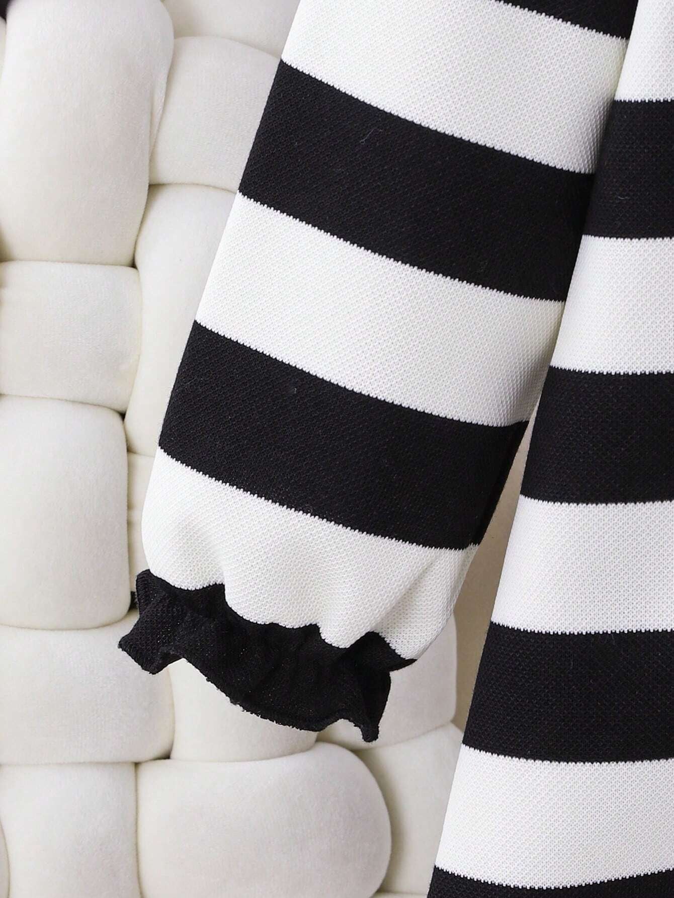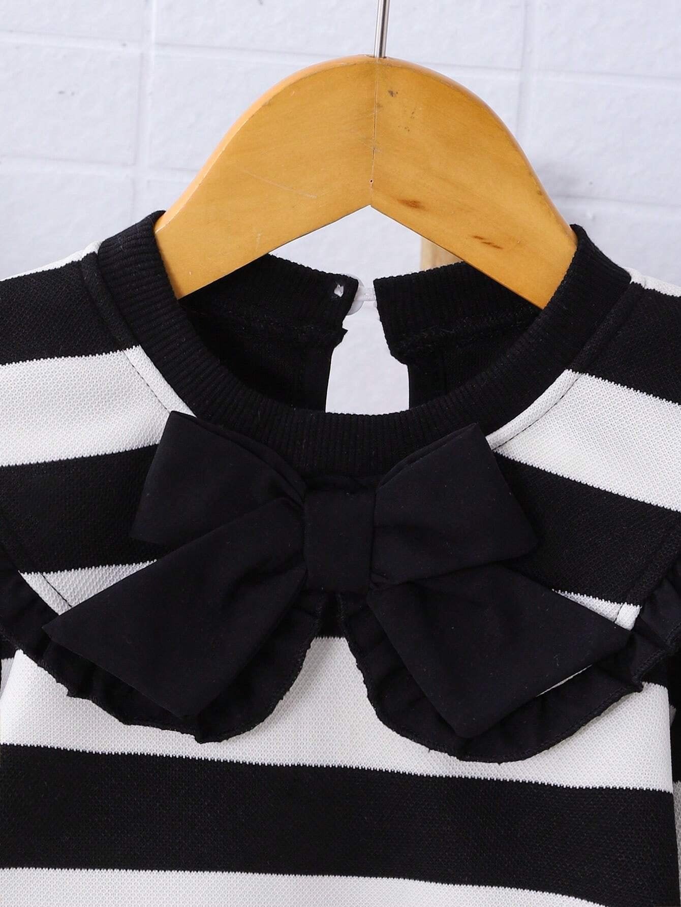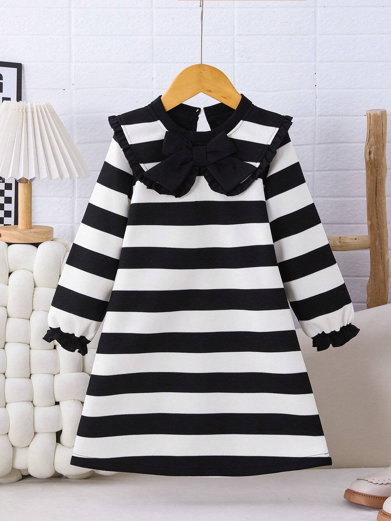 Vestido A Rayas Blanco Y Negro Con Moño Elegante Para Niña