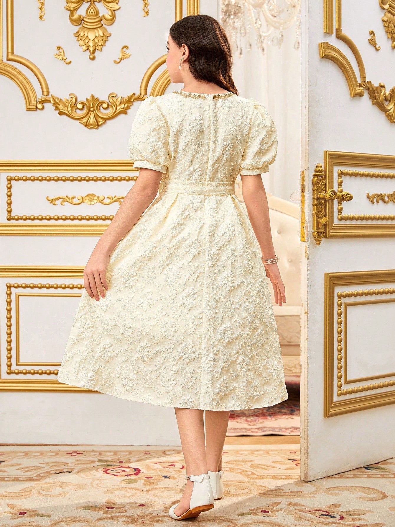 Vestido Albaricoque Midi Con Encaje Y Manga Farol Para Niña
