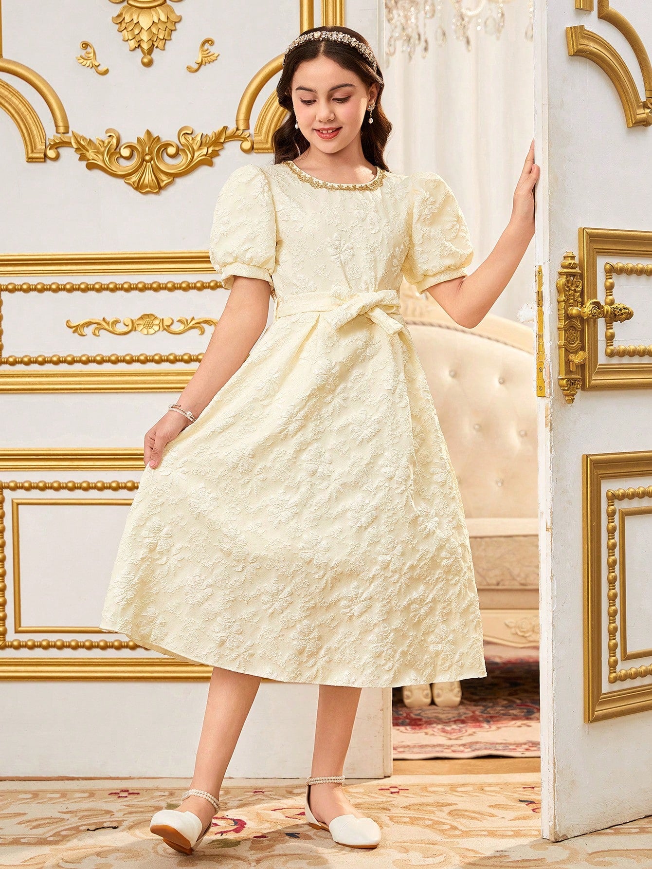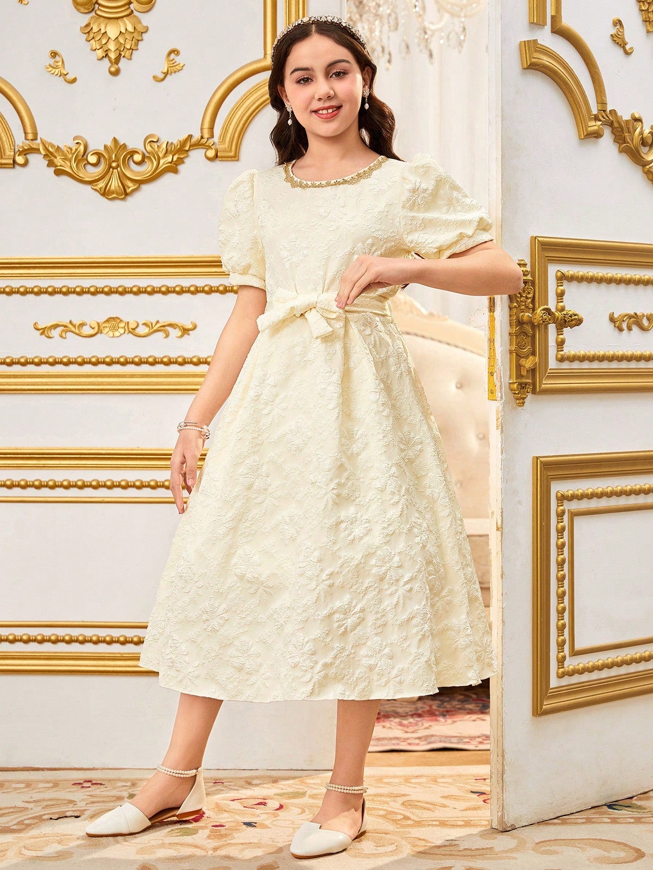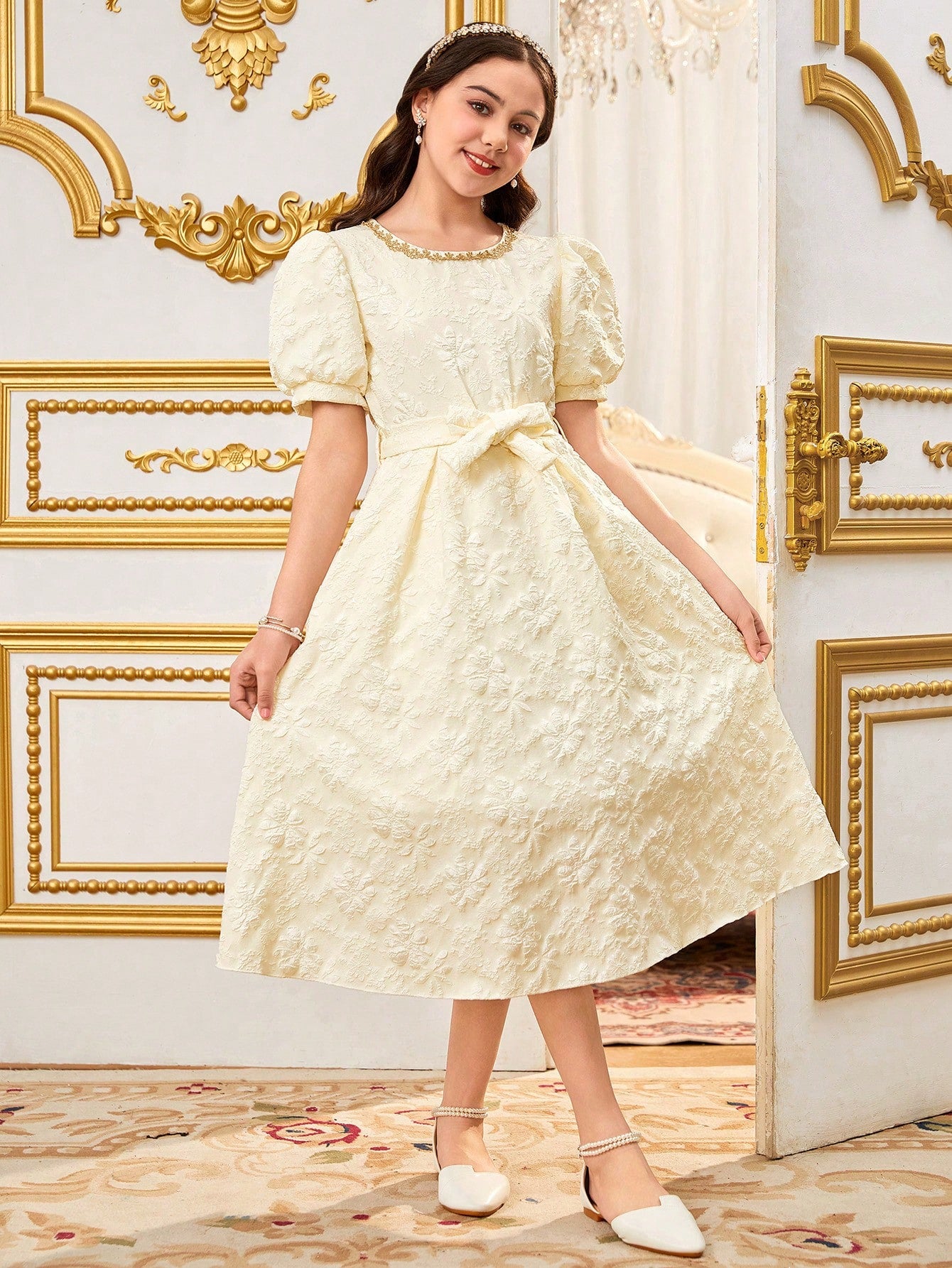 Vestido midi albaricoque para niña, con encaje delicado, manga farol y lazo en la cintura. Elegante y cómodo para bodas, comuniones y eventos especiales.