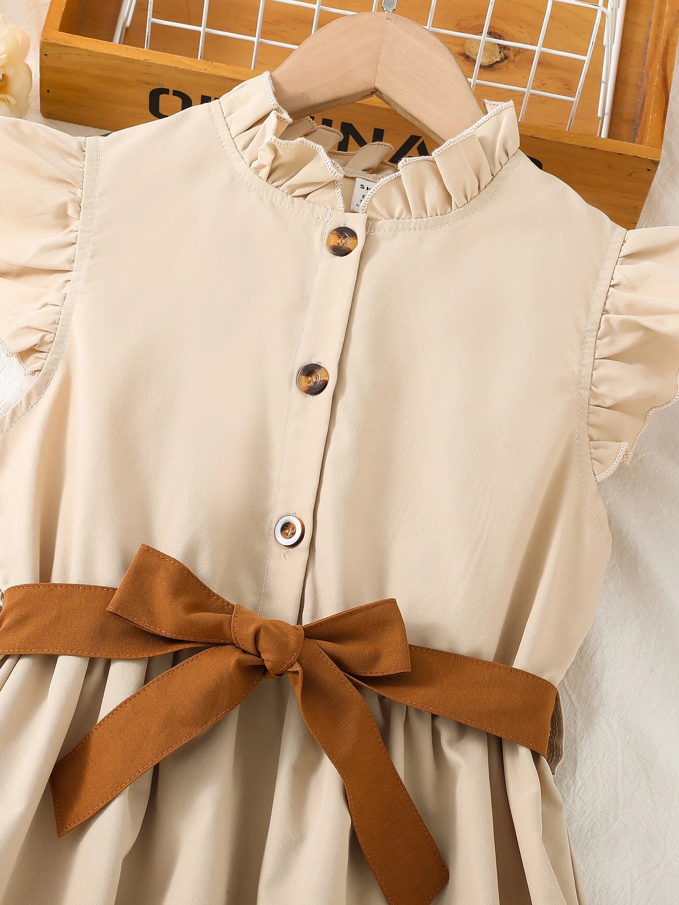 Este vestido albaricoque para niña con cinturón marrón combina dulzura y elegancia en una prenda ideal para ocasiones especiales y momentos inolvidables.