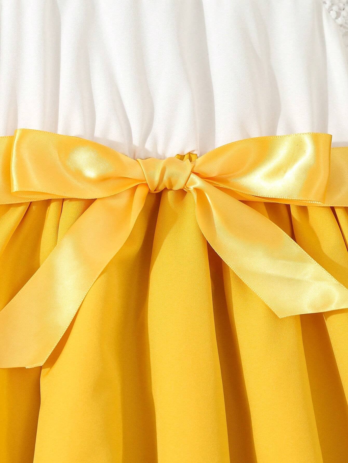 Este Vestido Amarillo Para Niña Con Encaje En Contraste combina luminosidad y elegancia, con falda campana y detalle de encaje blanco para ocasiones especiales.