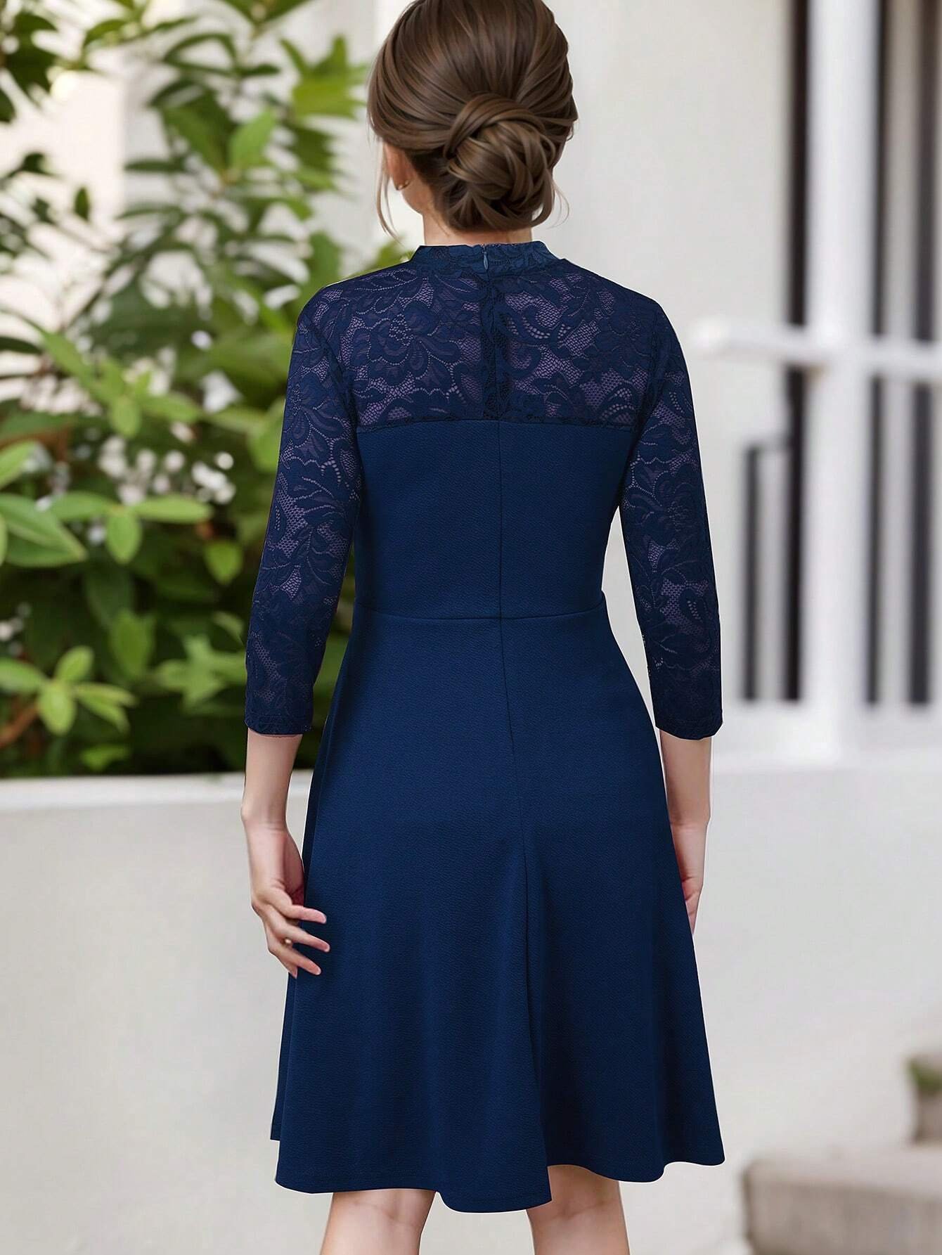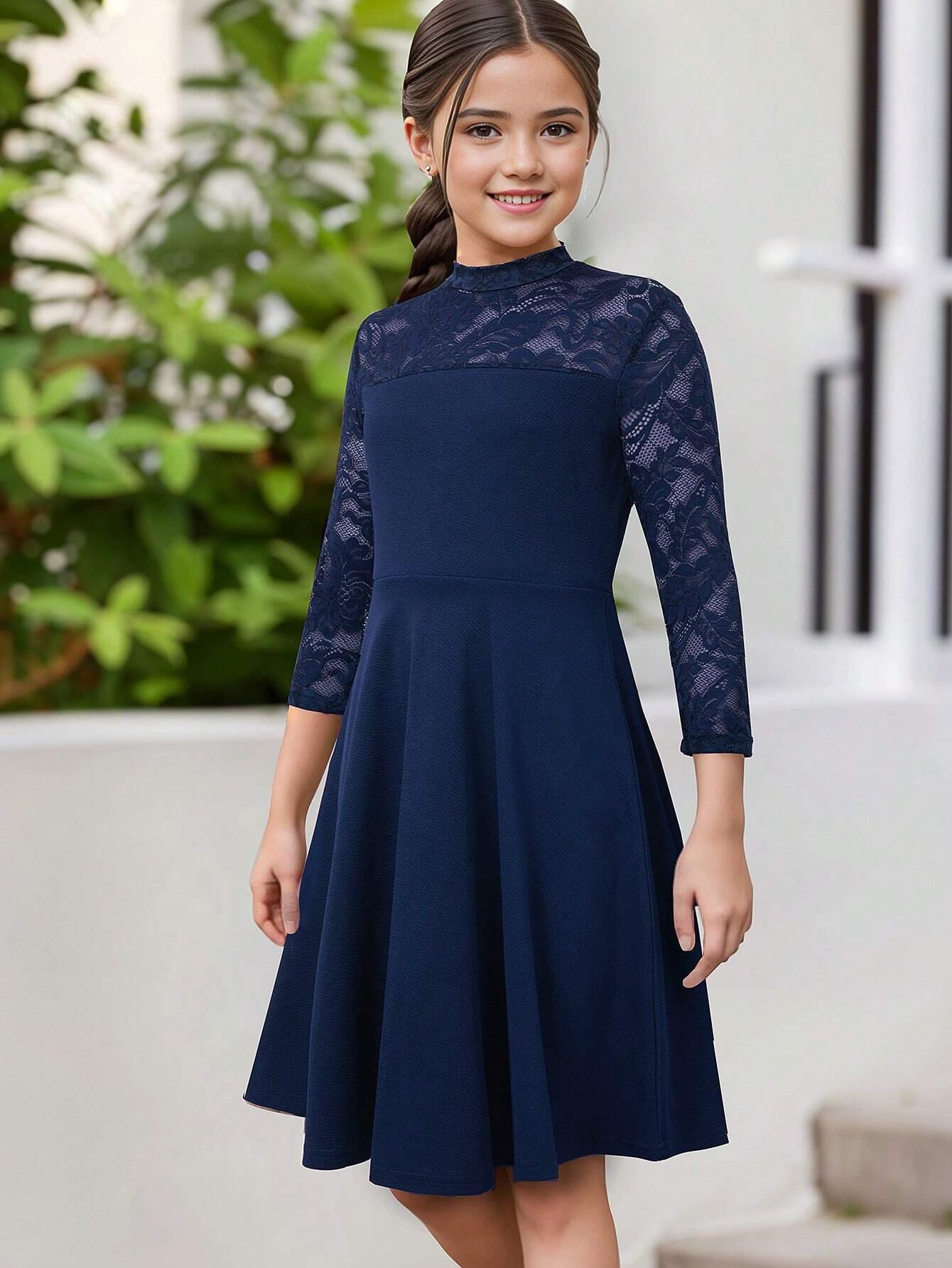 El Vestido Azul Con Encaje Elegante Para Niña combina distinción, delicadeza y modernidad en una sola prenda. Su silueta de corte A y largo midi lo convierte en una opción perfecta para eventos formales, celebraciones o sesiones fotográficas. El detalle más llamativo es el encaje floral que cubre la parte superior del pecho, espalda y mangas, aportando un toque de sofisticación y estilo.