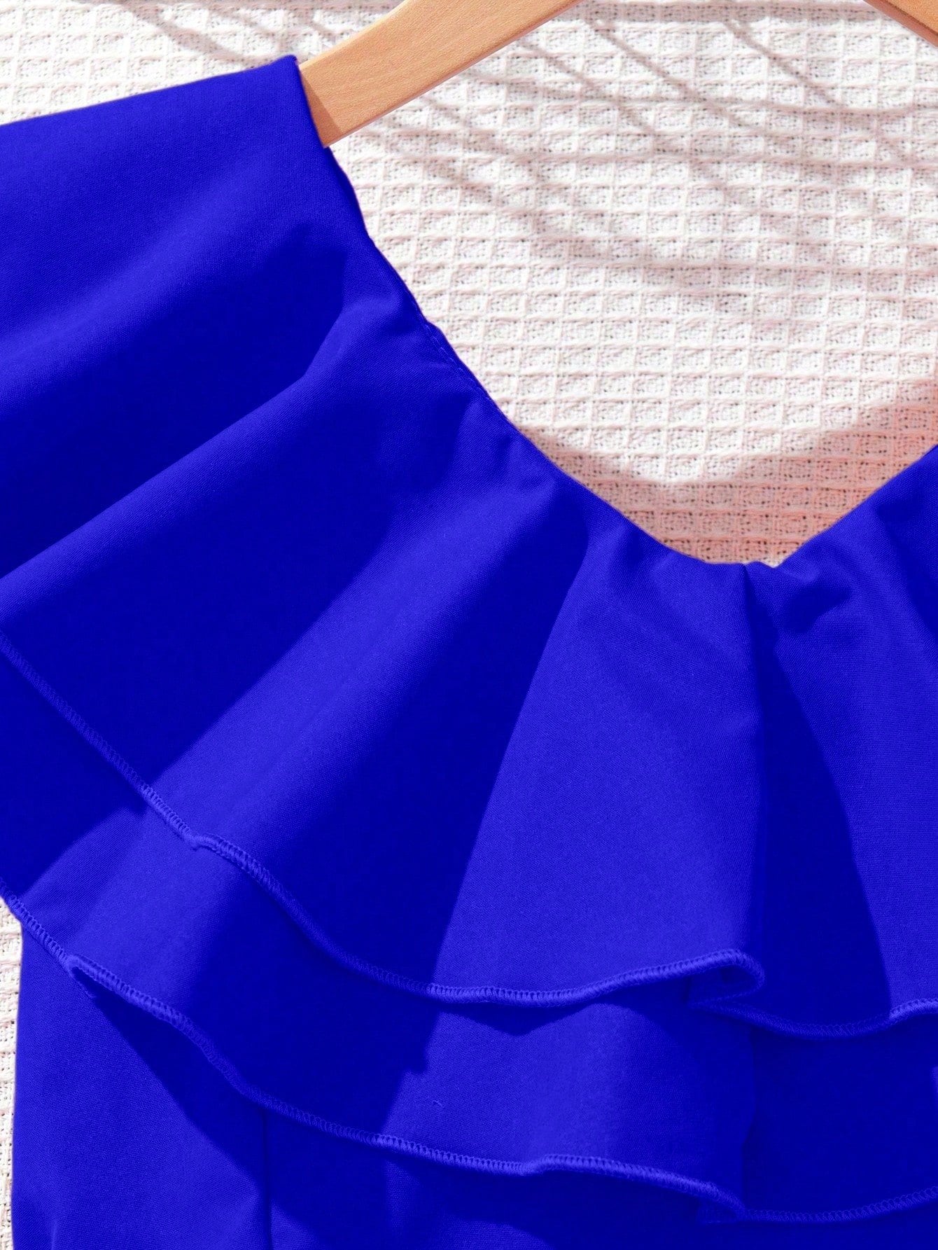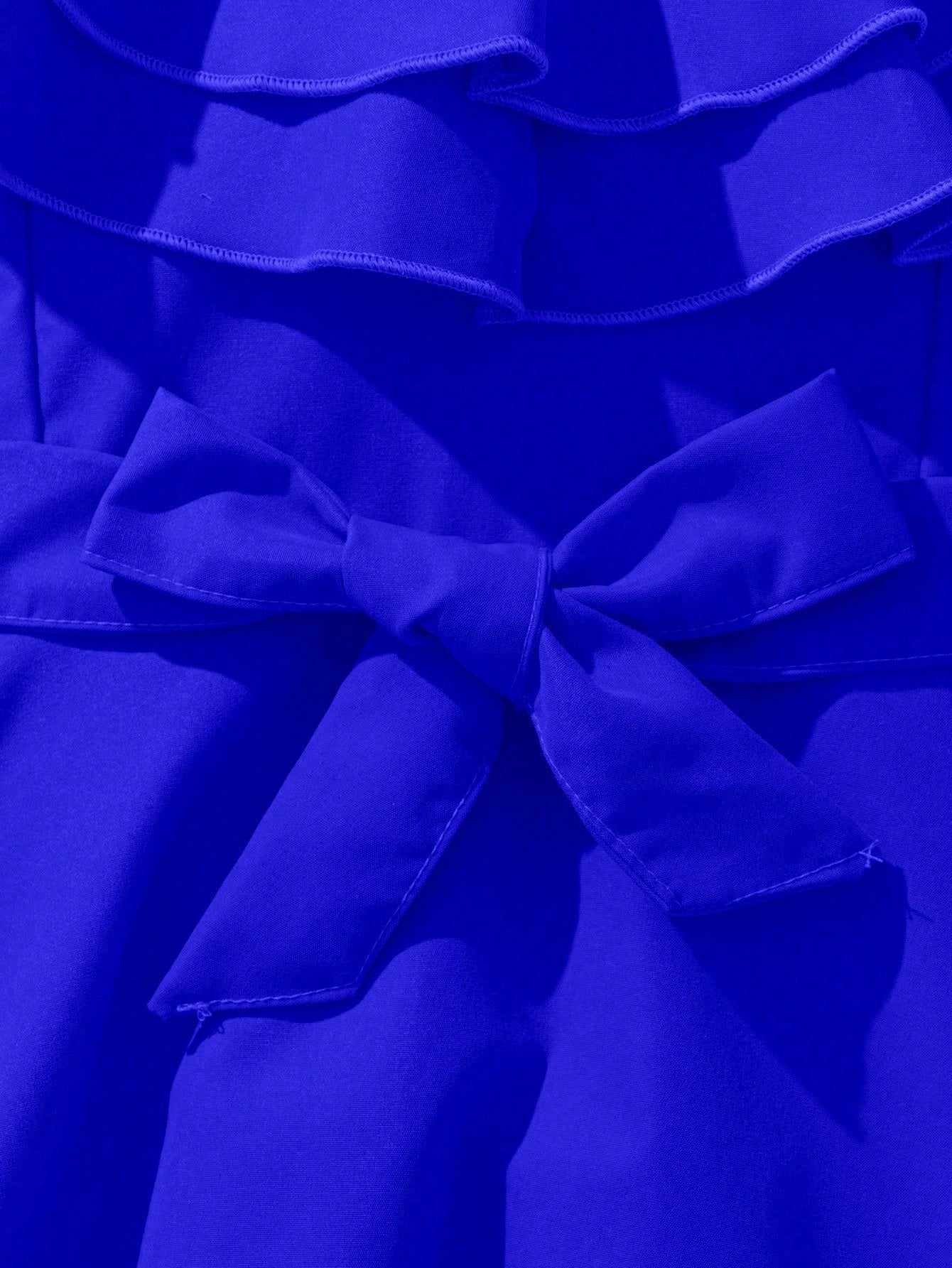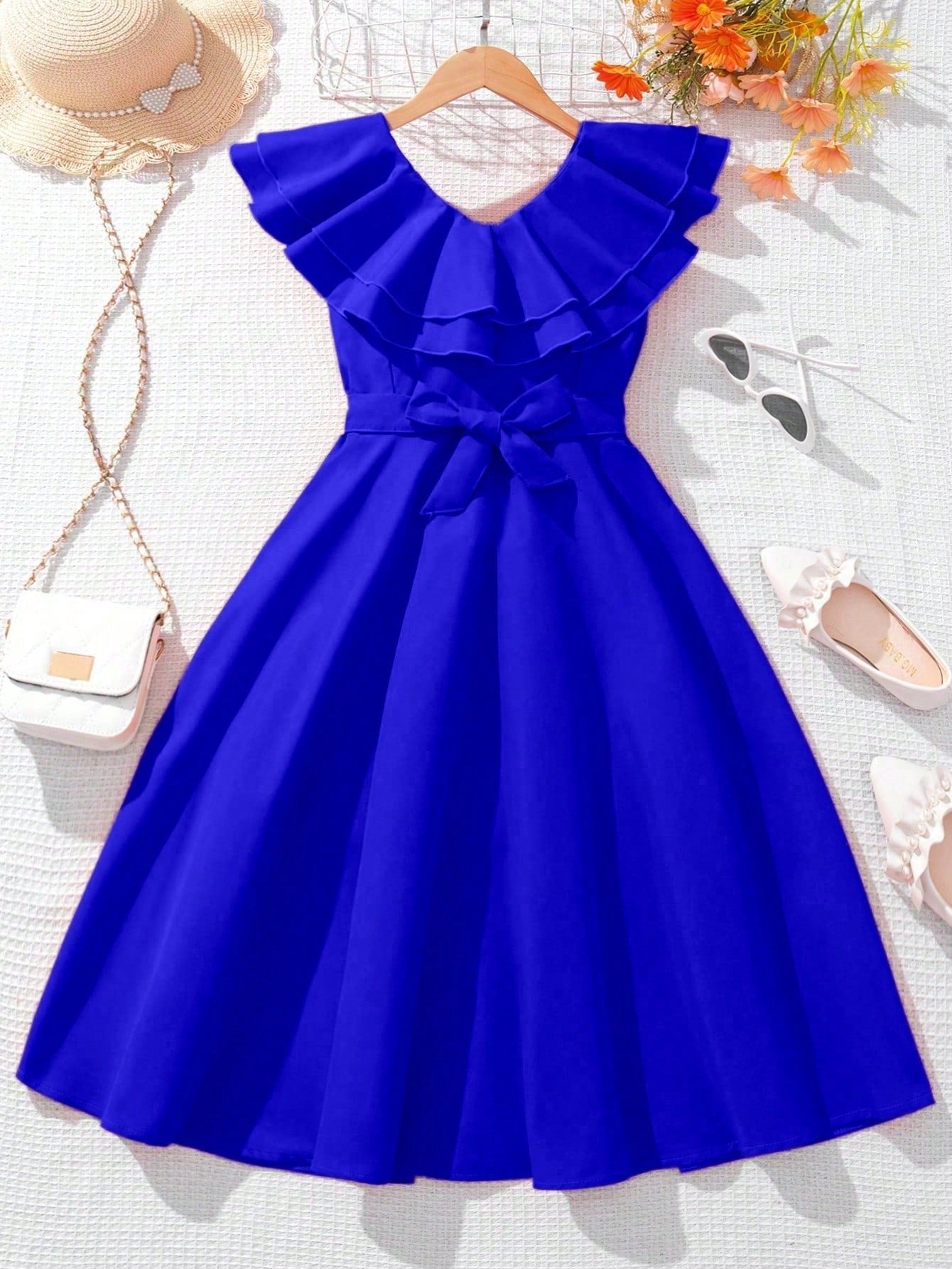 El Vestido Azul Con Volantes Y Lazo Para Niña deslumbra con un diseño elegante que mezcla dulzura y movimiento. Su silueta en corte A-línea con falda amplia brinda una caída fluida, perfecta para cualquier ocasión especial. El escote redondo se realza con un doble volante que enmarca la parte superior con un efecto delicado y llamativo.