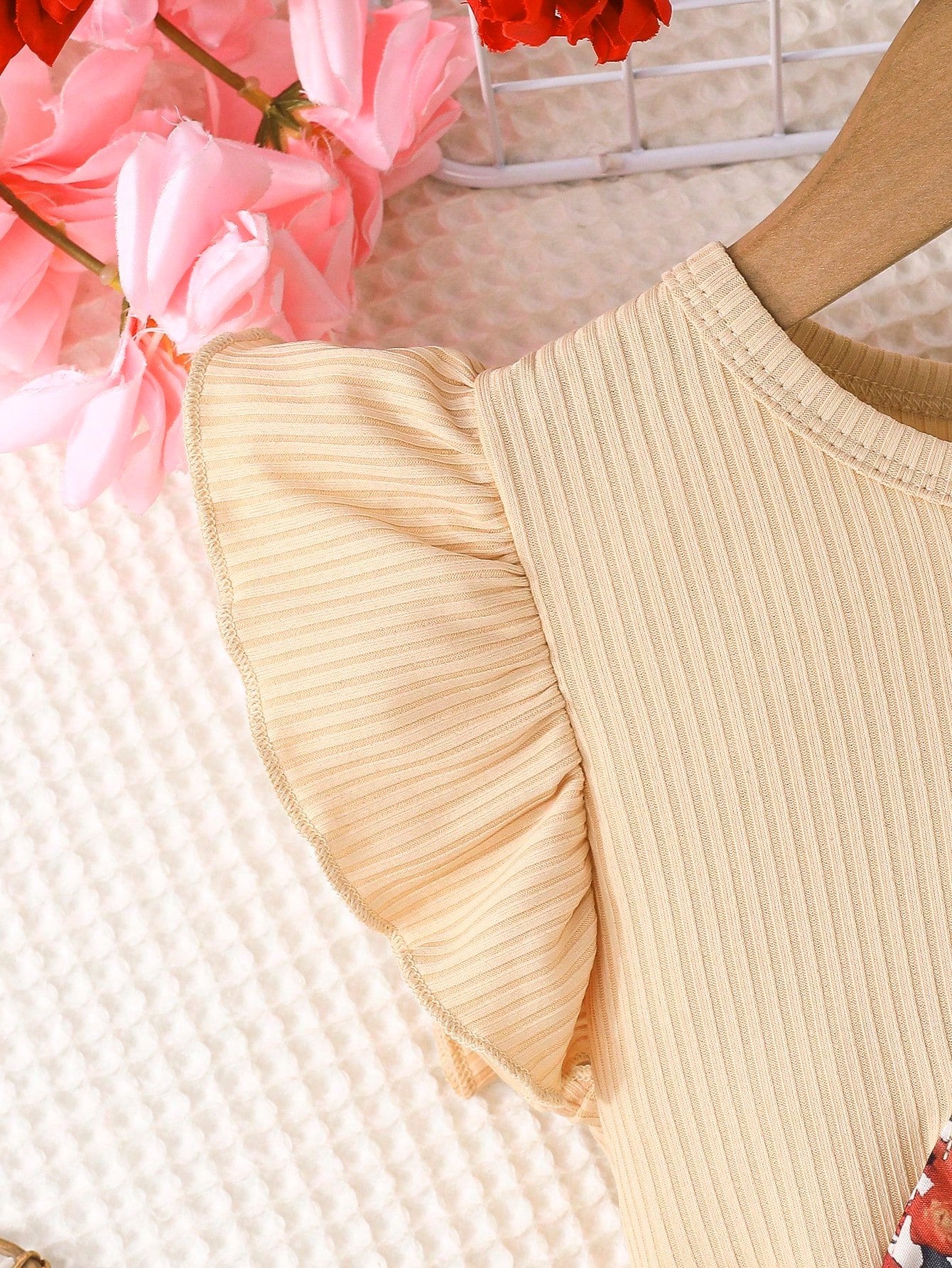 Vestido Beige Con Volantes Y Falda Floral Para Niña