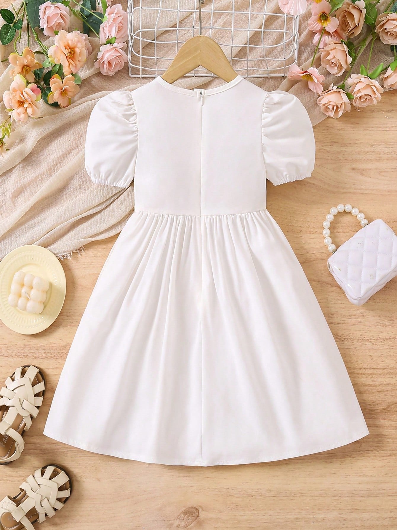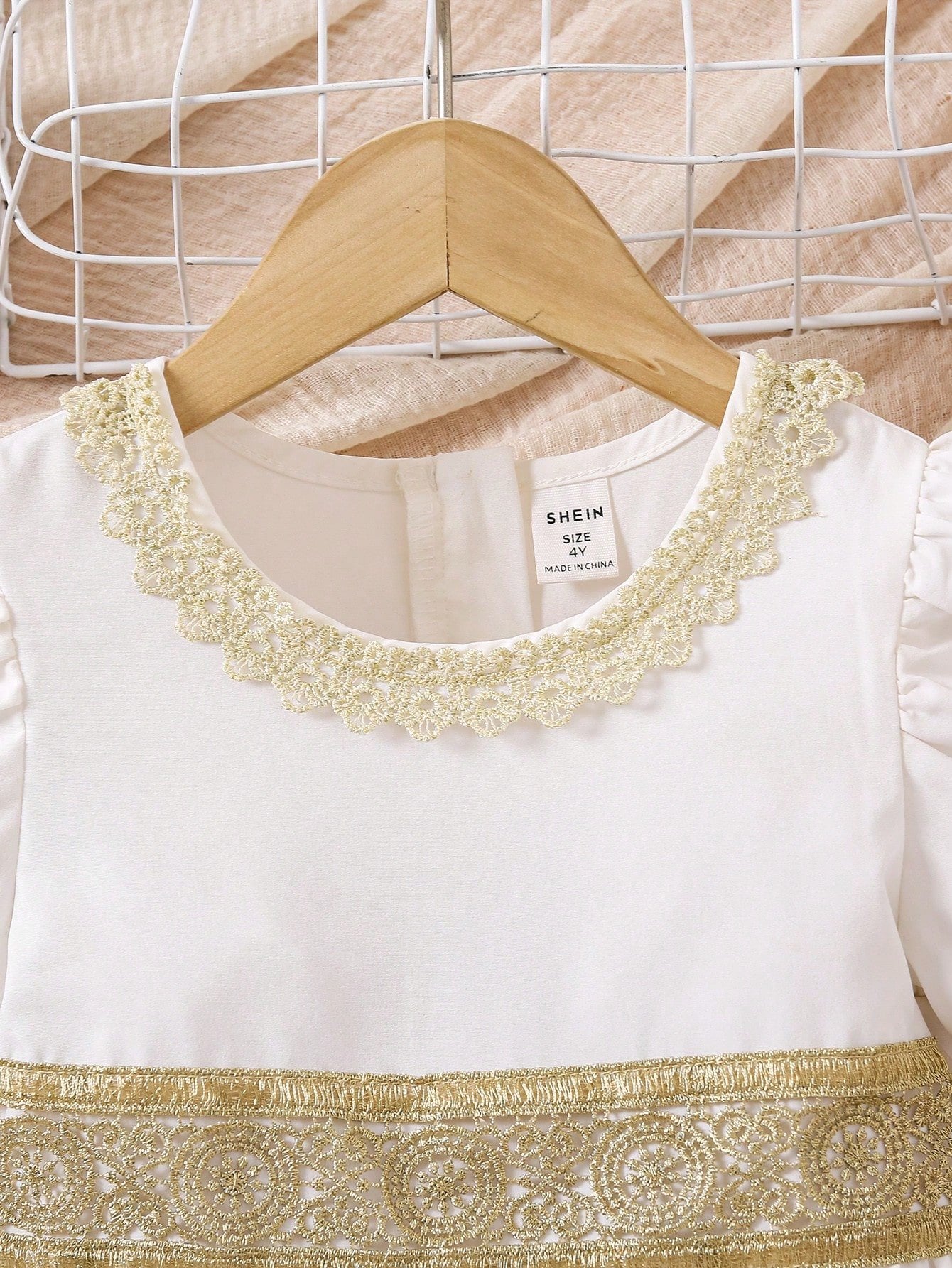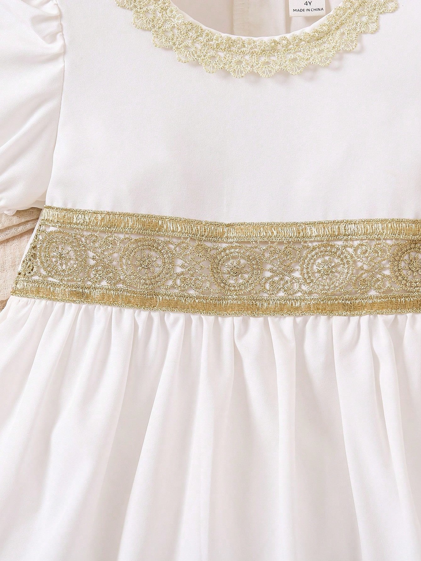 Este vestido blanco con manga farol para niña es ideal para ocasiones especiales, con detalles de encaje dorado y una silueta dulce que resalta su elegancia natural.