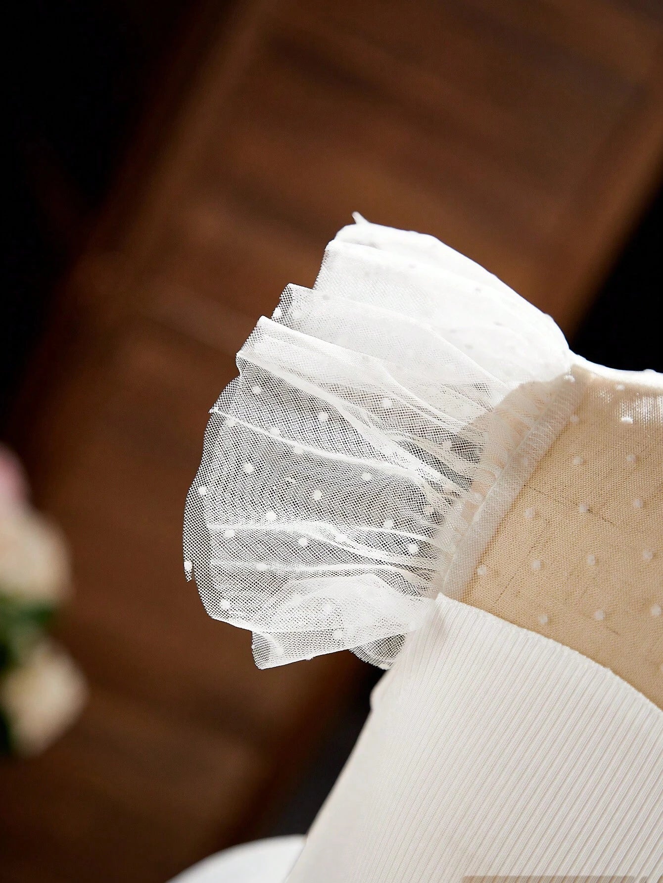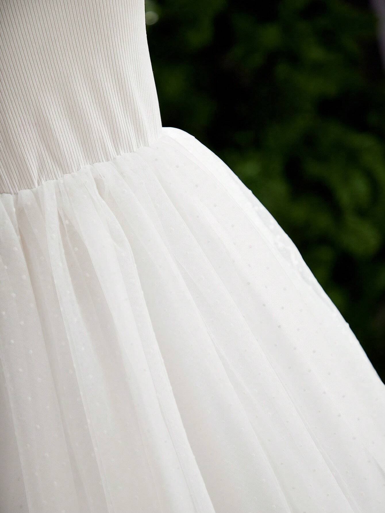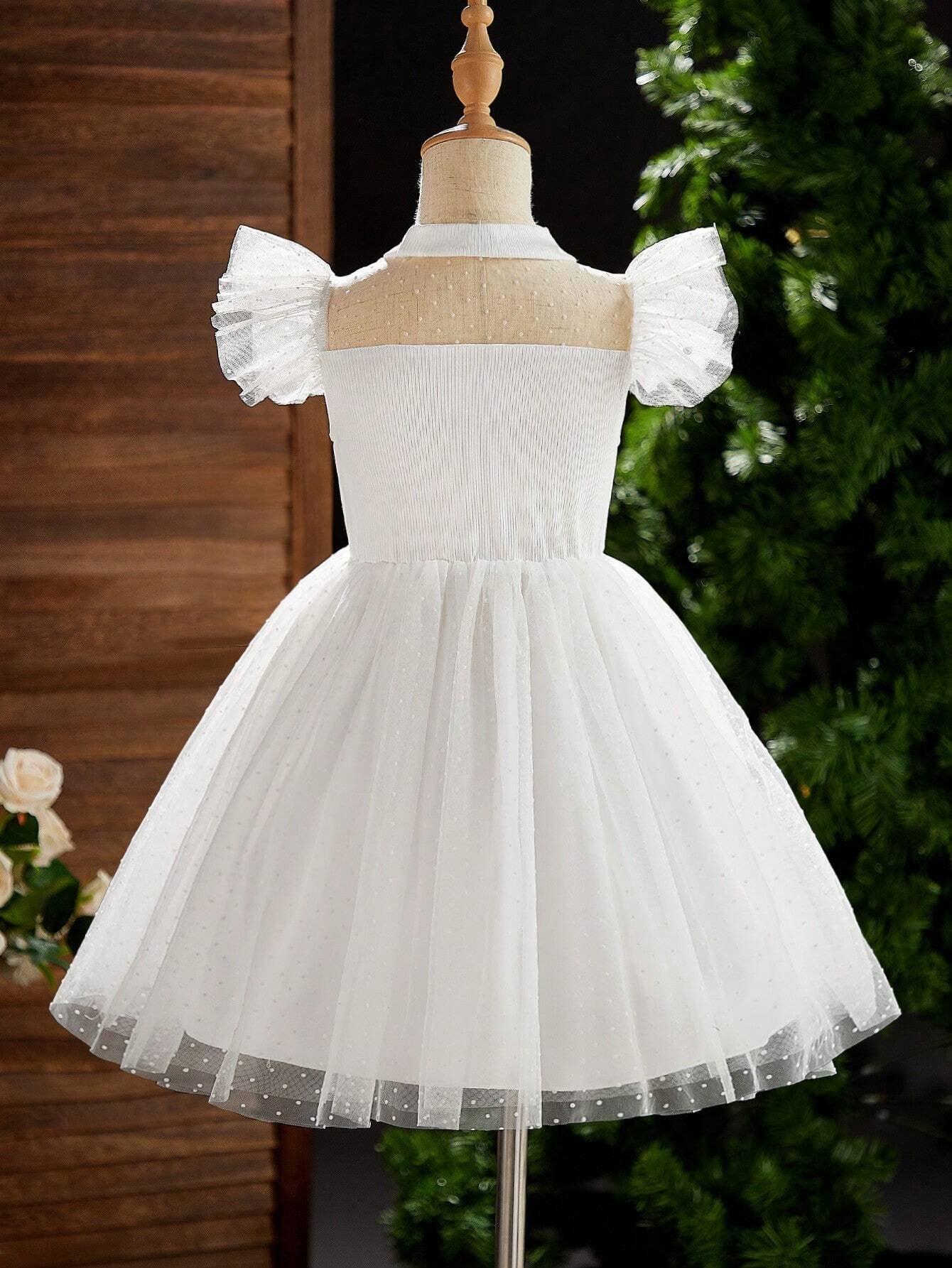 El Vestido Blanco Con Tul De Princesa para niña está diseñado para momentos inolvidables. Su corte de inspiración clásica con falda amplia estilo campana lo convierte en la opción perfecta para celebraciones especiales. La parte superior cuenta con un cuerpo plisado que se ajusta con elegancia, mientras que el escote alto con detalle de malla semitransparente y las mangas cortas con volantes en tul le añaden un aire etéreo y encantador.