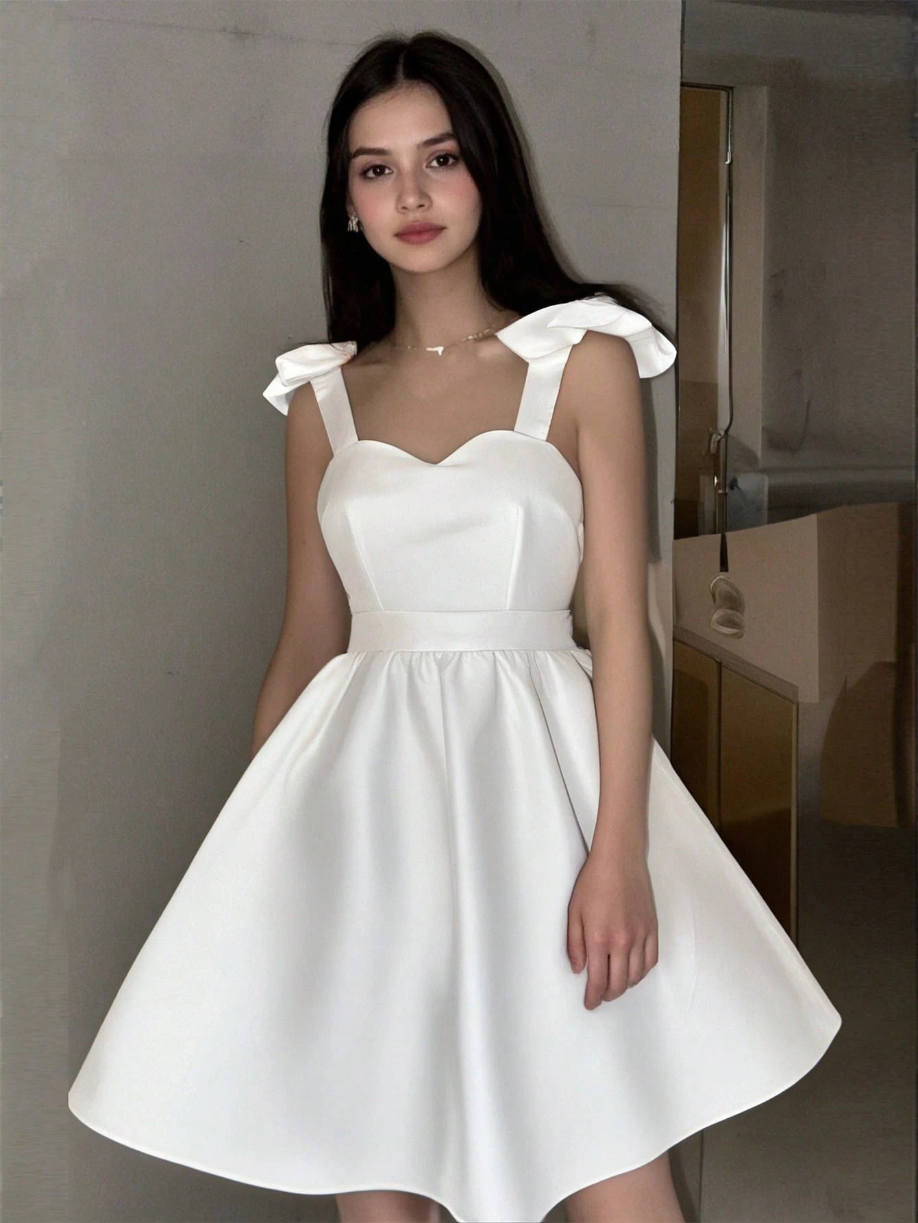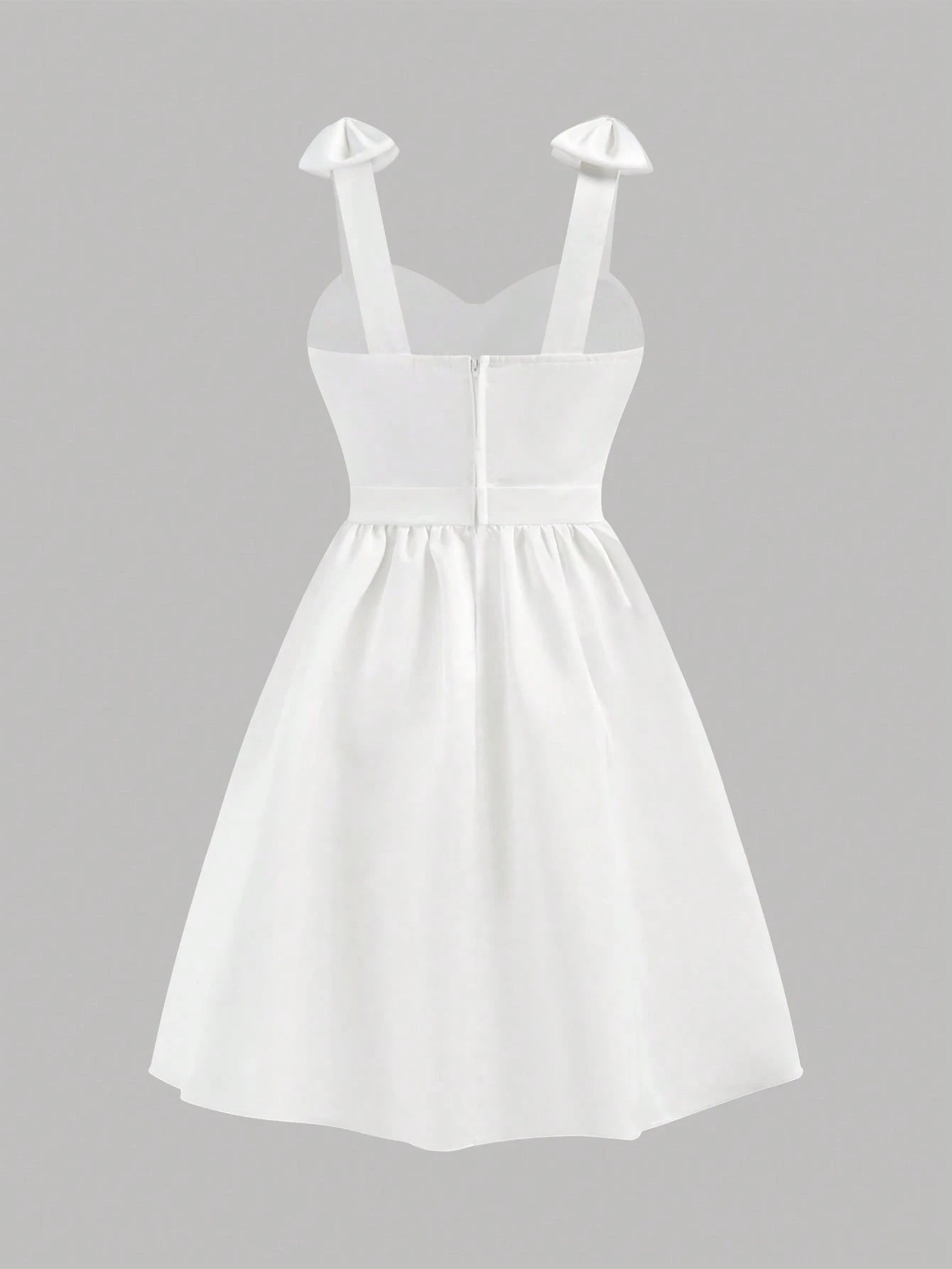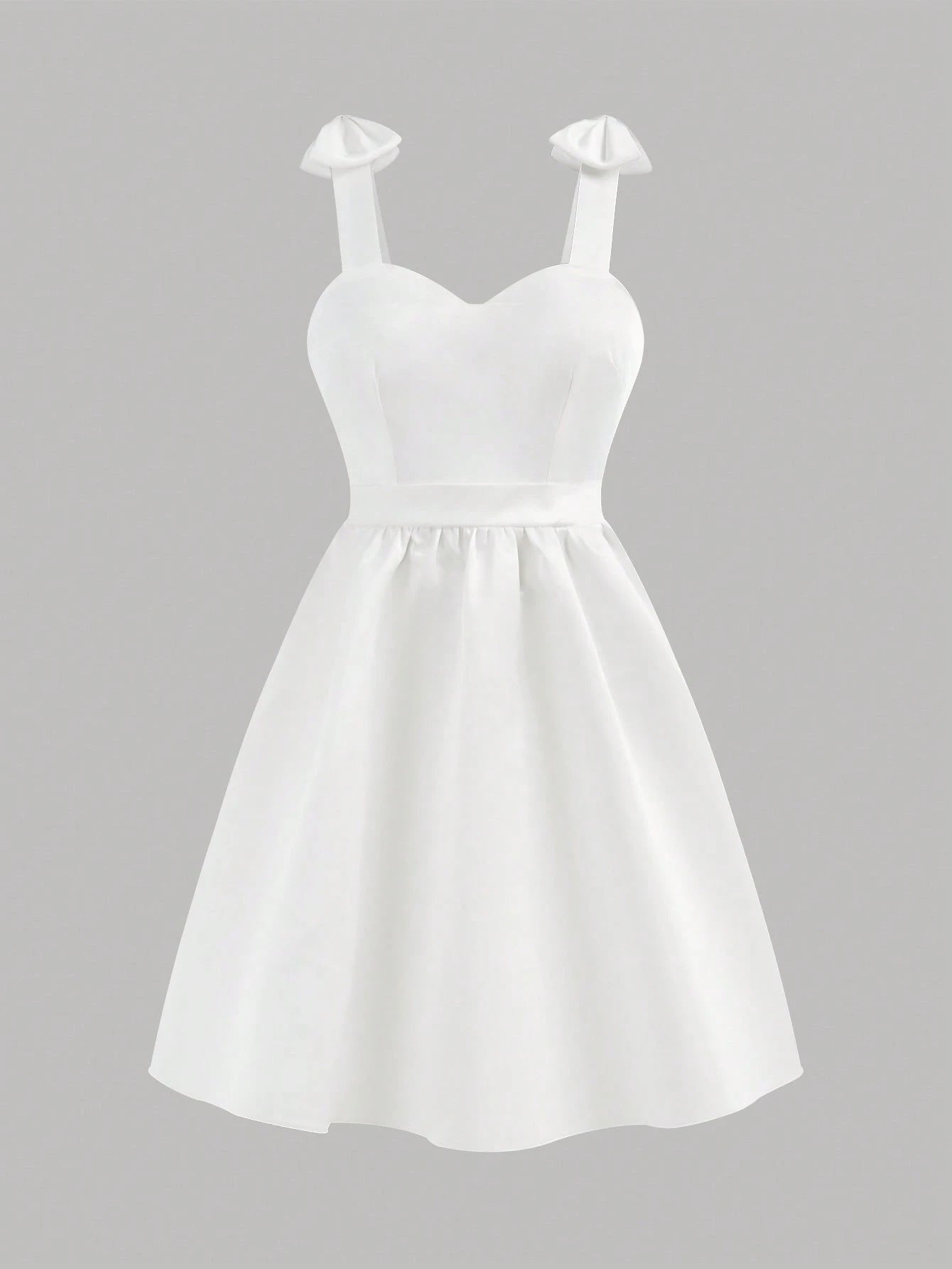 El Vestido Blanco Corto Con Lazo Para Niña es una pieza encantadora que destaca por su frescura y estilo. Con un corte de falda campana y un talle alto, crea una silueta favorecedora y elegante que realza la figura de manera delicada. Su escote en forma de corazón y los tirantes adornados con lazos aportan un toque romántico y distintivo, perfecto para resaltar la dulzura natural de cada niña.