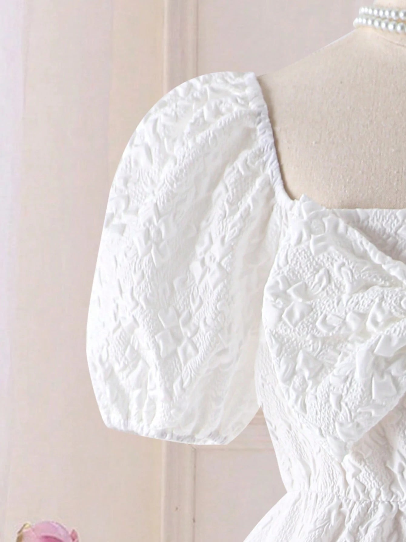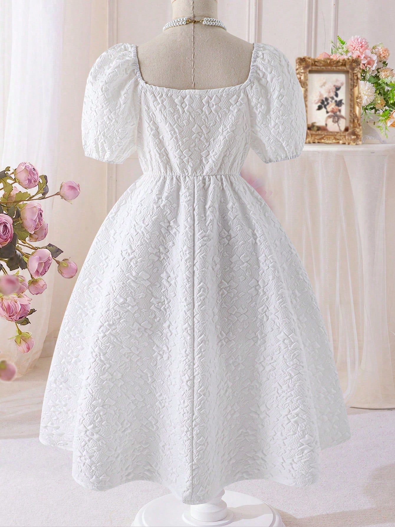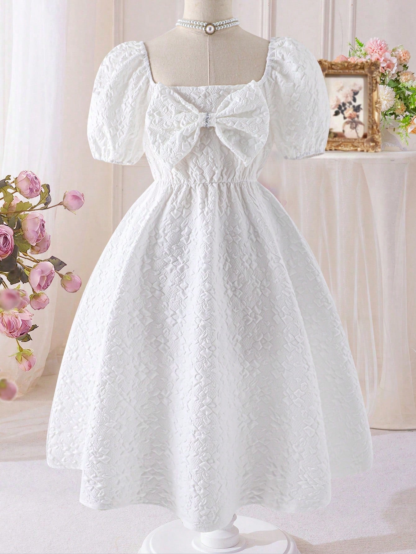 Vestido Blanco Texturizado Con Lazo Grande Para Niña