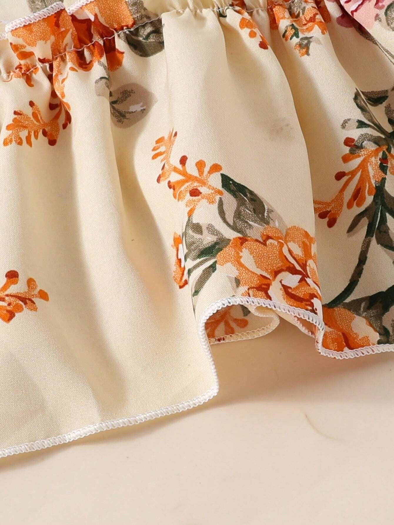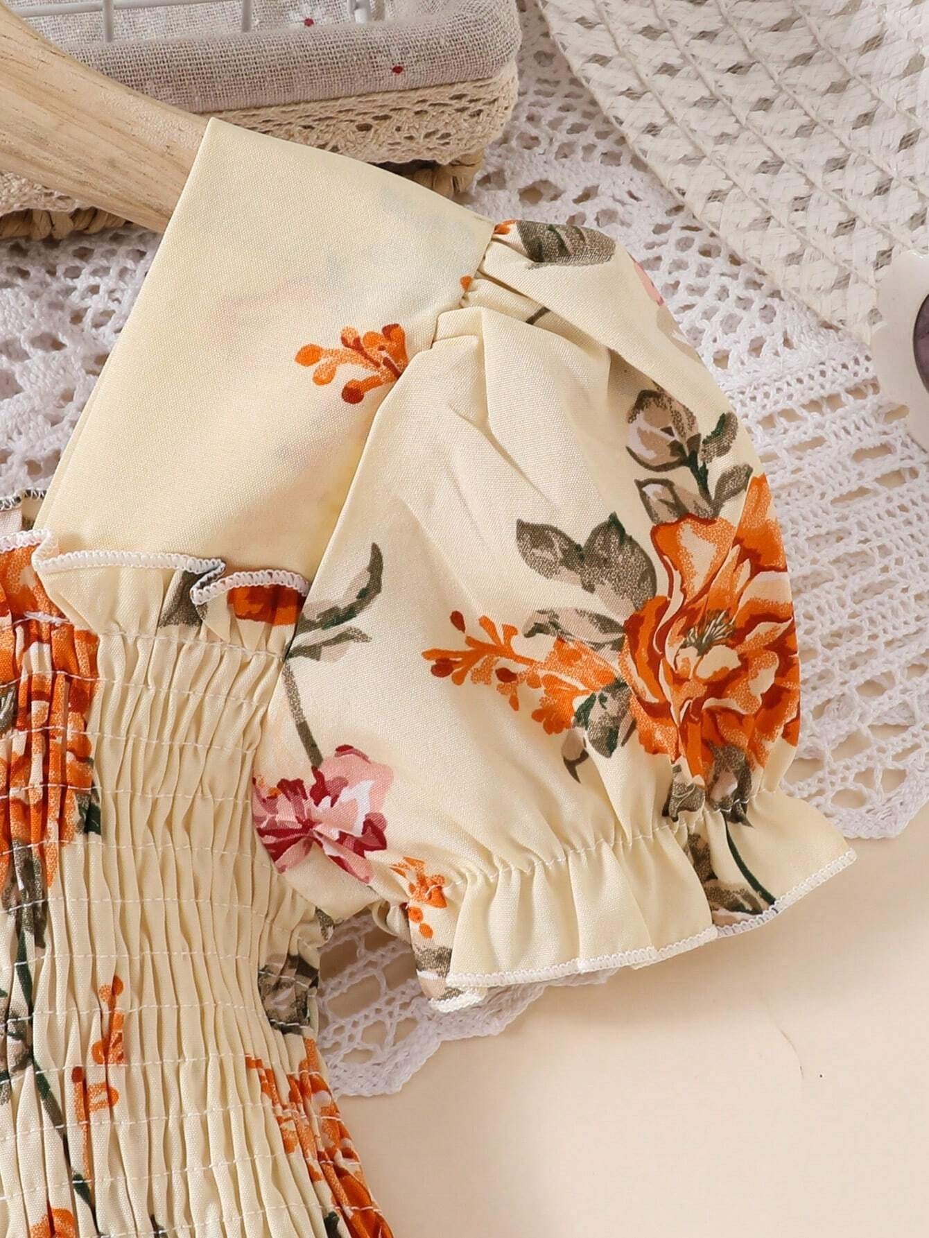 Este vestido bohemio floral albaricoque para niña tiene un diseño encantador con mangas farol, fruncido en el pecho y volantes que lo hacen perfecto para momentos especiales.