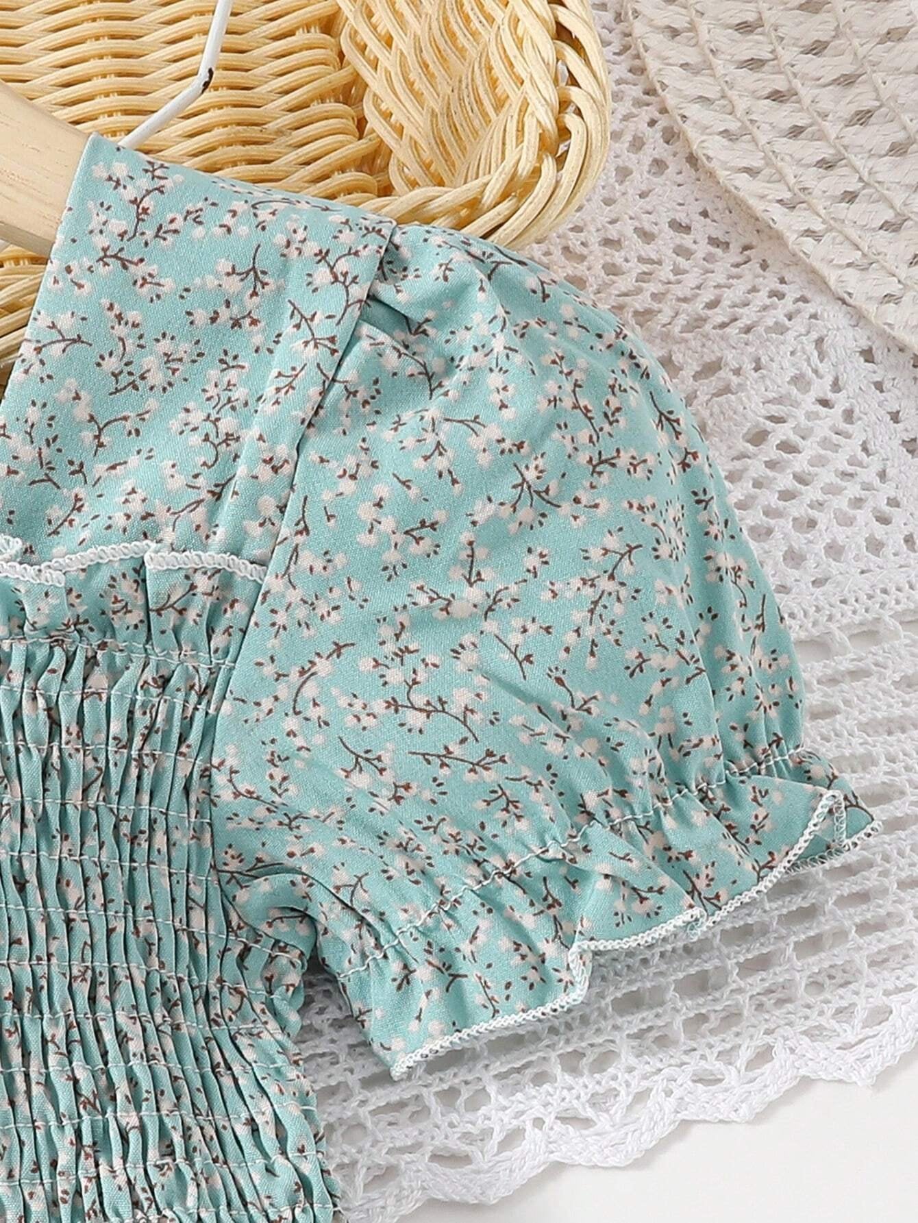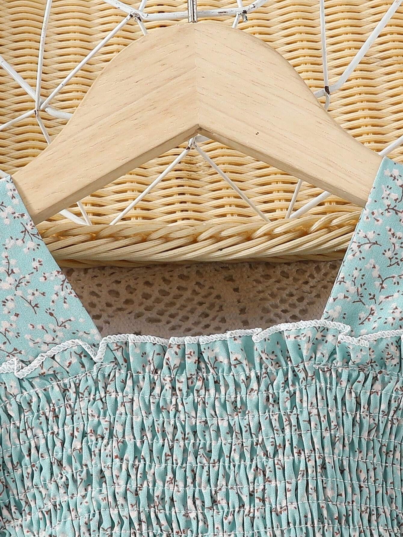 Este vestido bohemio verde con flores para niña es ideal para días especiales, con mangas farol y fruncido suave que le darán un look dulce y encantador.