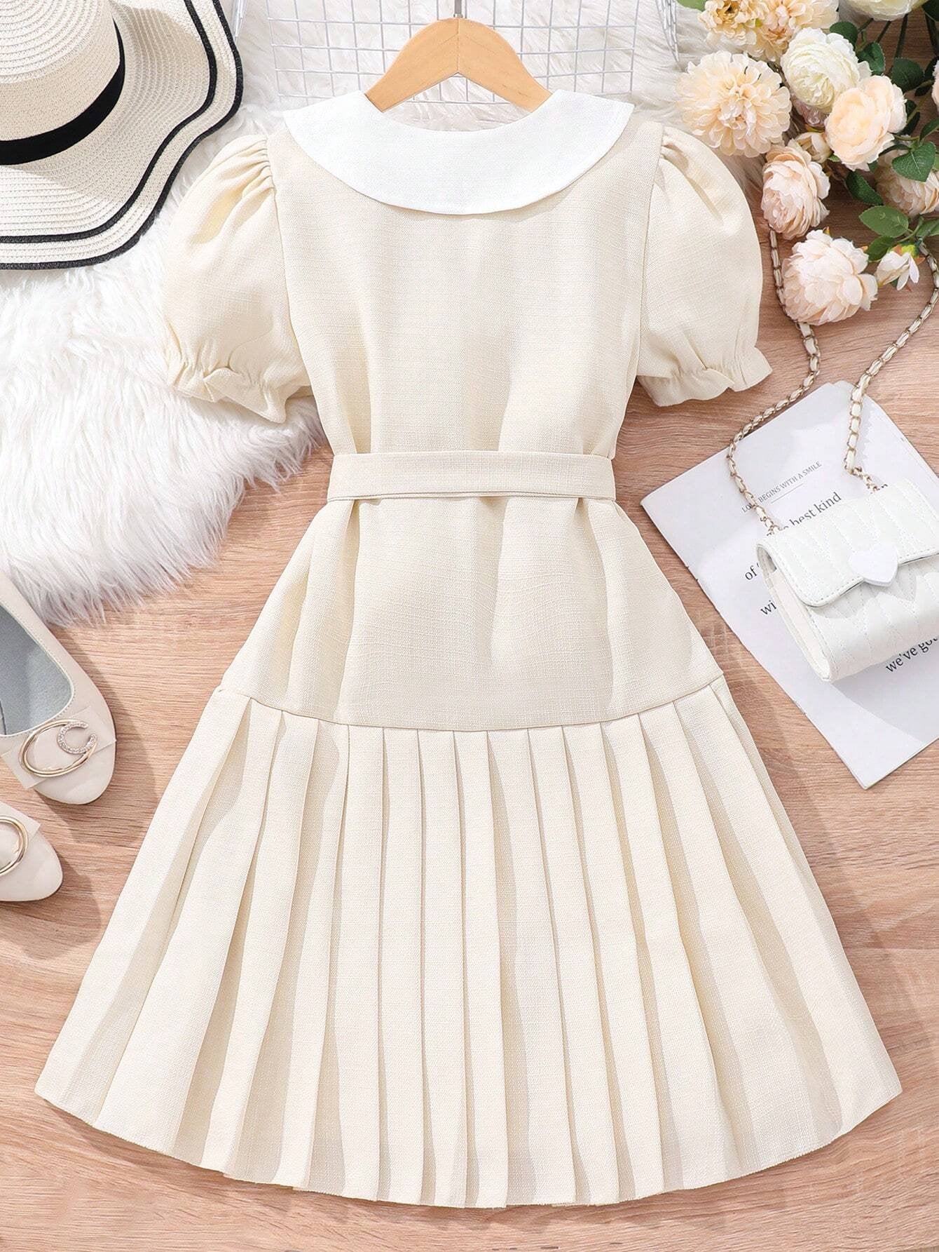 Este vestido camisero albaricoque plisado para niña combina elegancia con un estilo moderno. Su corte tipo camisa, cinturón y falda plisada lo hacen irresistible.