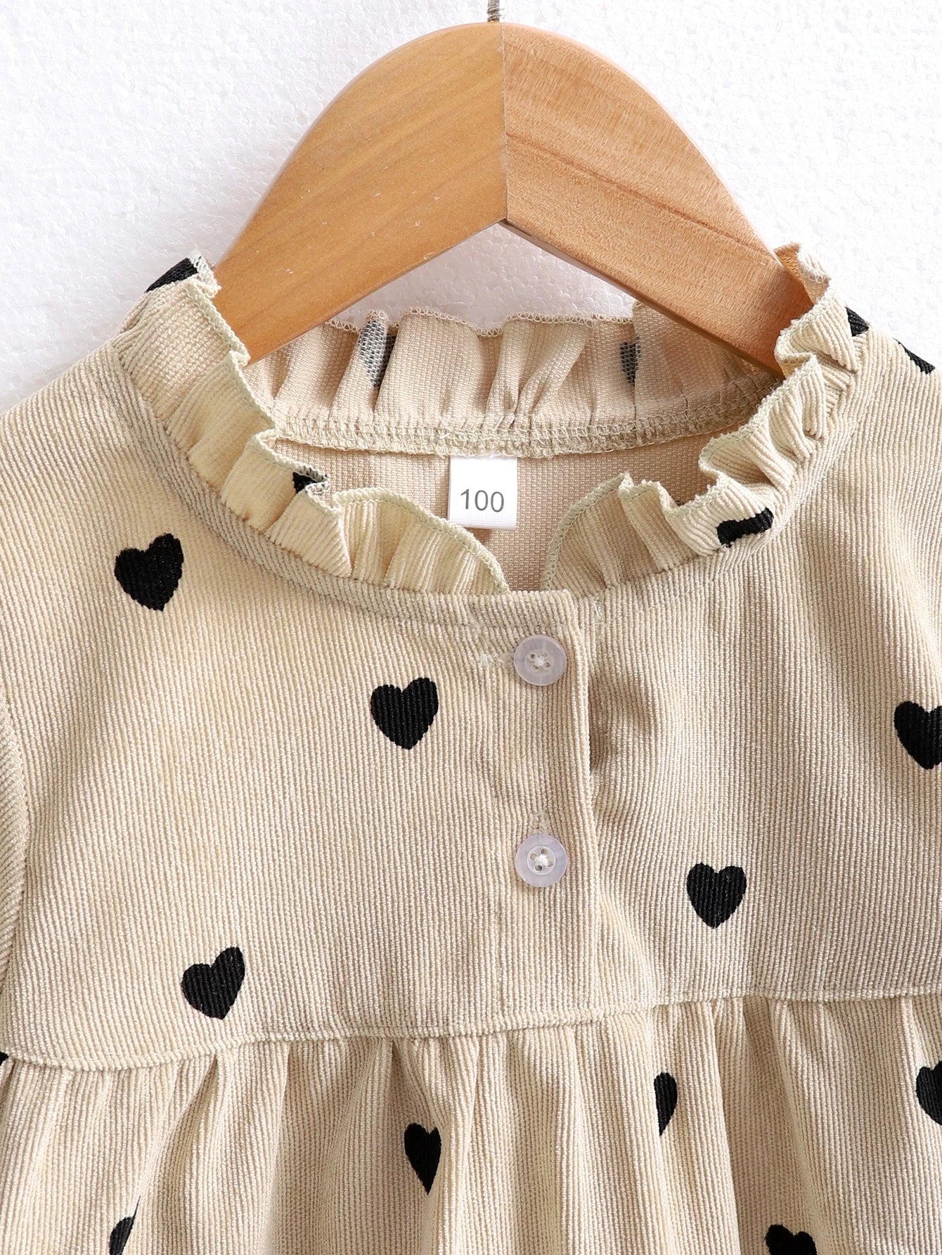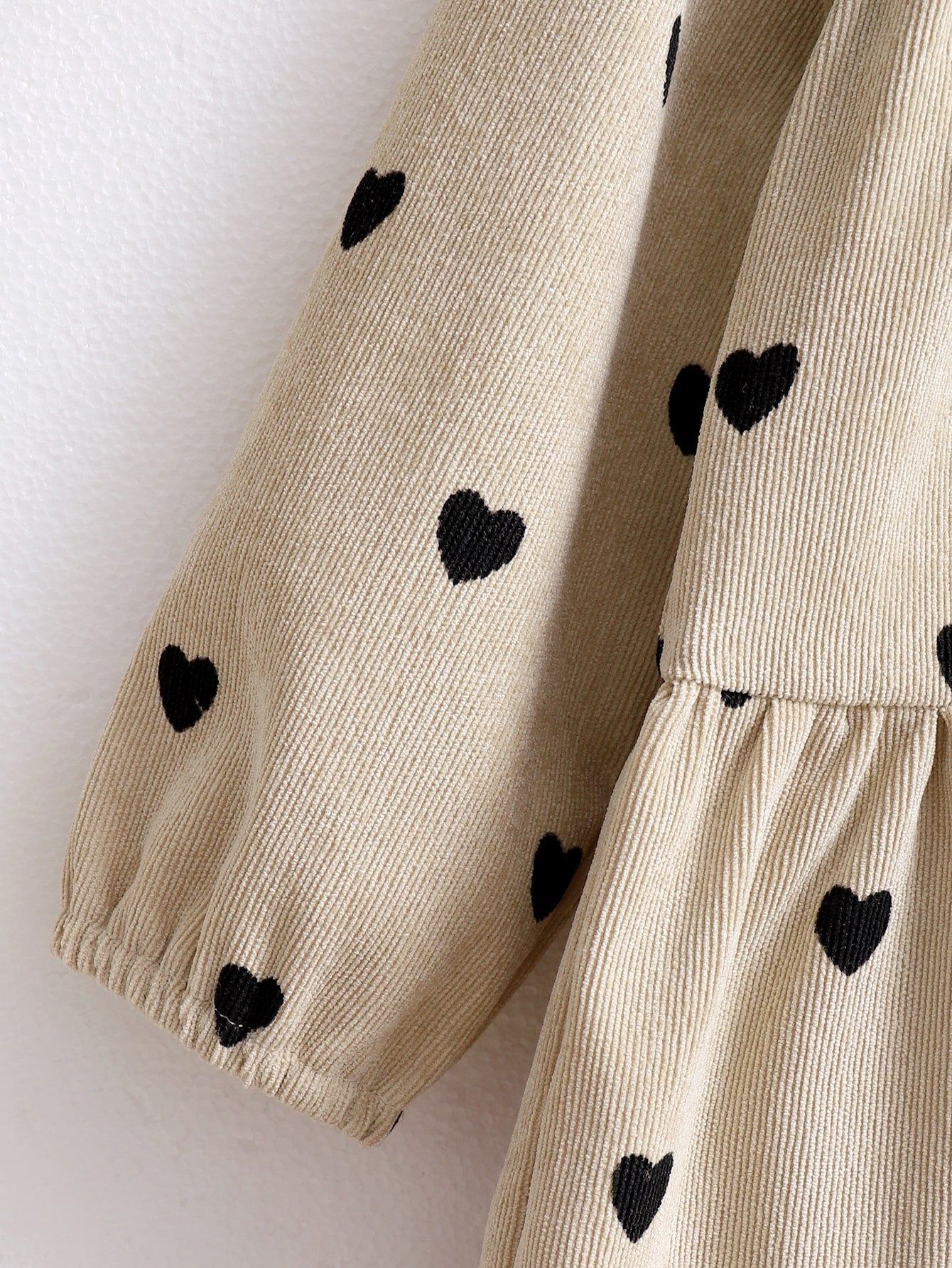 Este vestido de pana con corazones negros para niña es ideal para el día a día. Su diseño dulce y cómodo enamora a cualquier mamá.