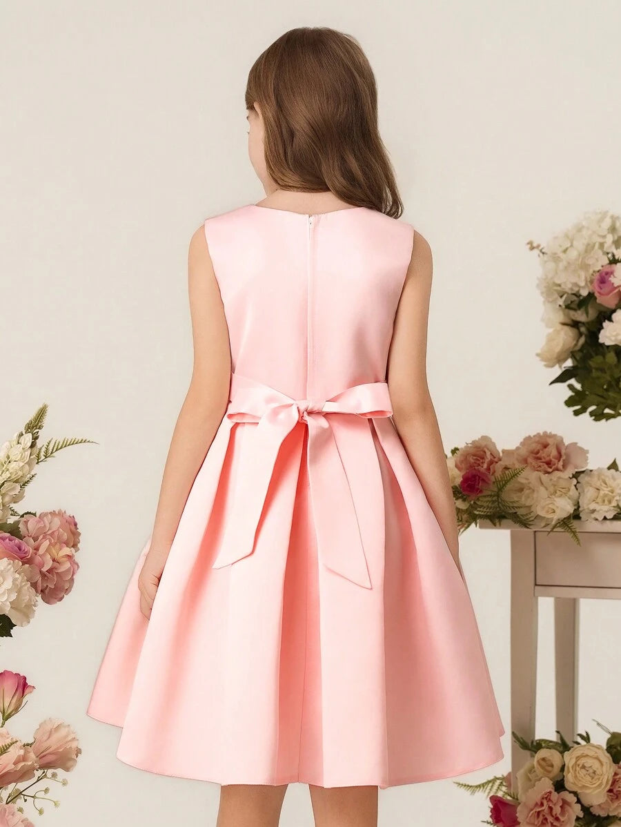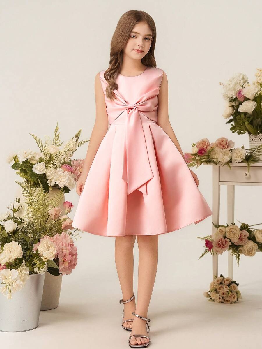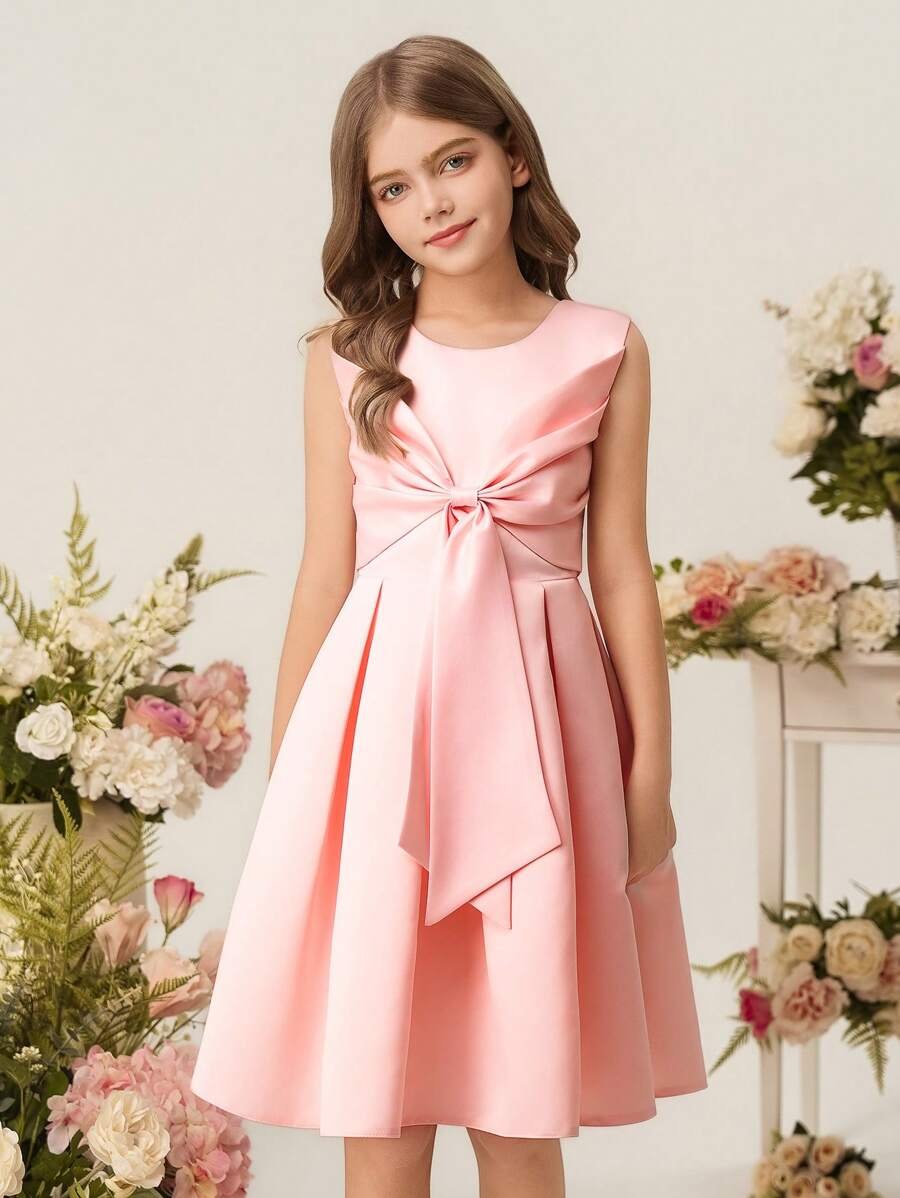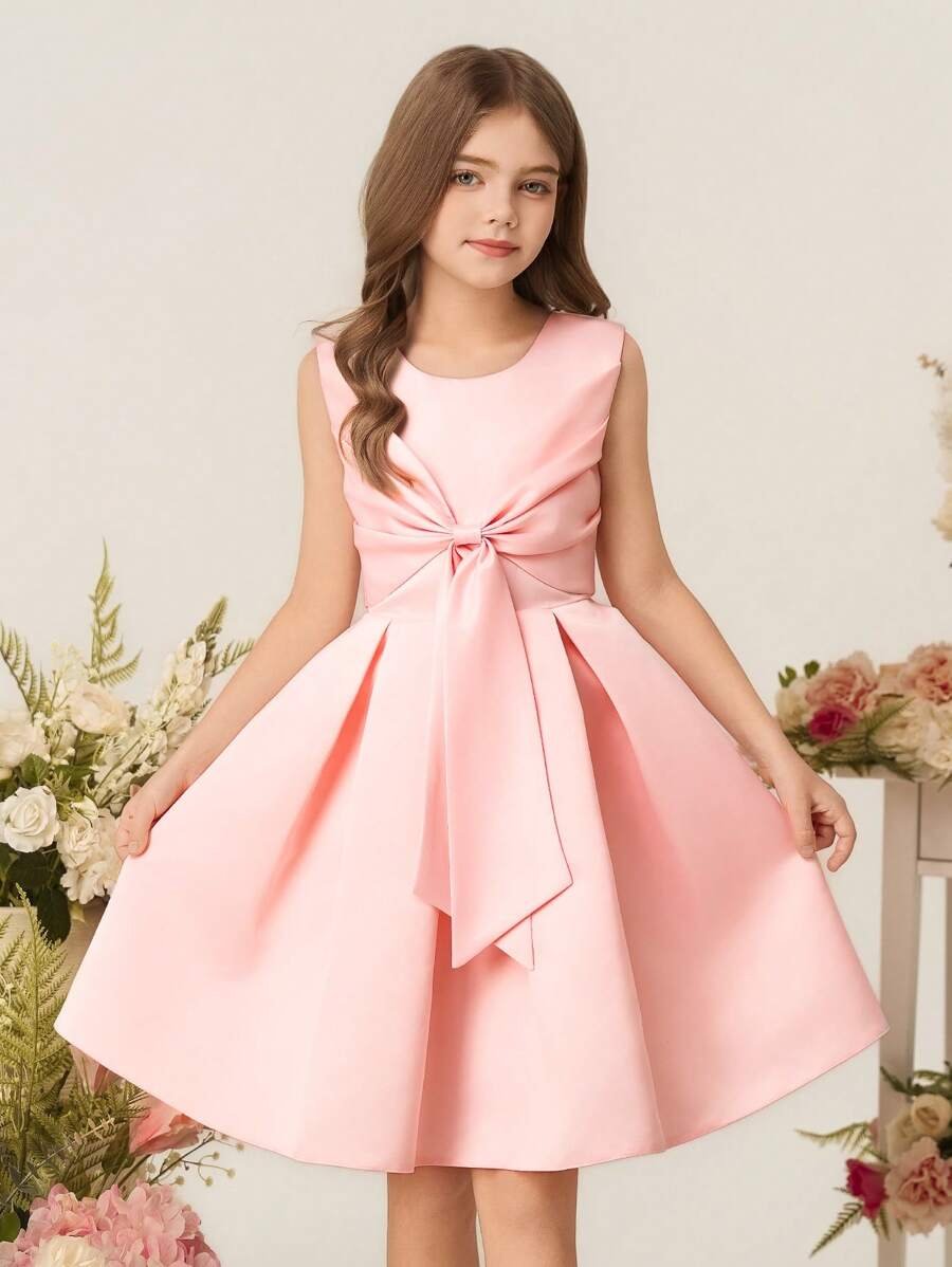 Vestido Elegante Rosa Para Niña Con Lazo Delantero