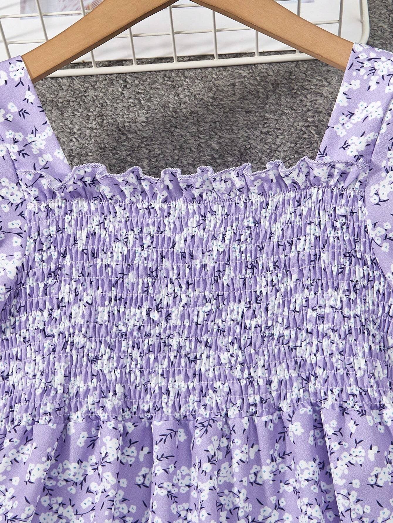 Vestido Floral Morado Para Niña Con Volantes Y Manga Farol