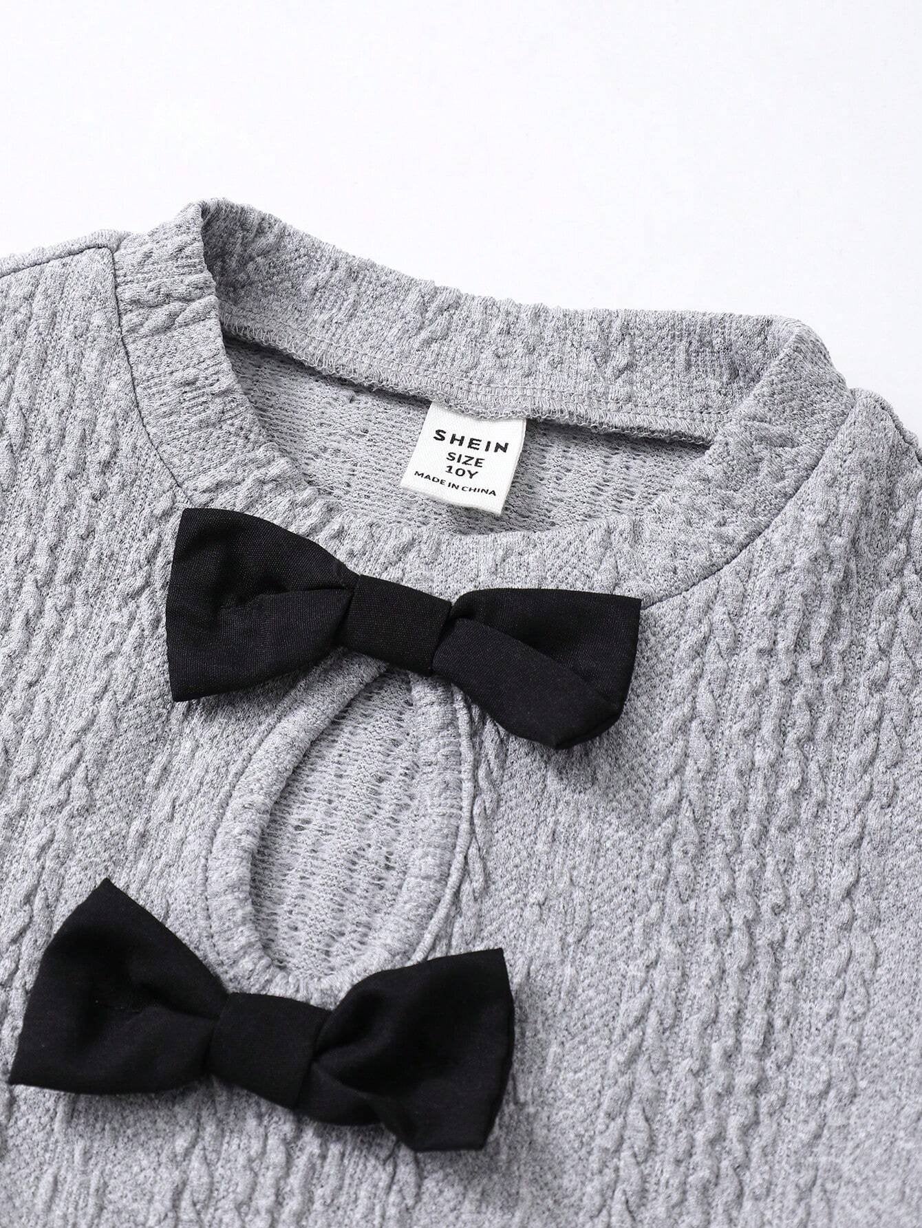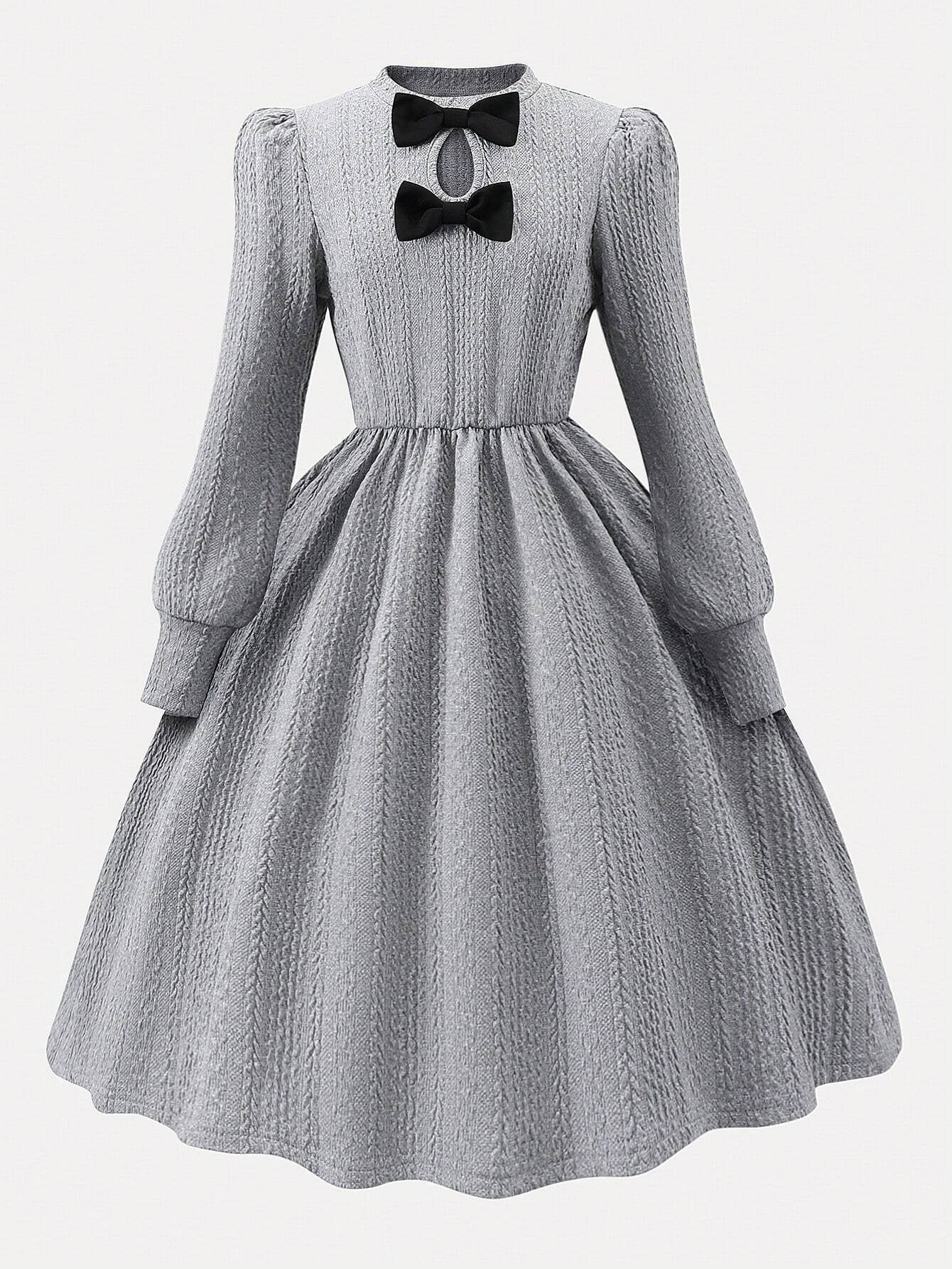 El Vestido Gris Con Lazo Elegante para niña preadolescente fusiona dulzura y sofisticación en una prenda única. Presenta un corte acampanado que cae con gracia desde la cintura, creando un efecto voluminoso y encantador. Su cuello redondo con escote tipo lágrima añade un detalle sutilmente coqueto, rematado por dos lazos negros que aportan un toque distintivo de elegancia vintage.