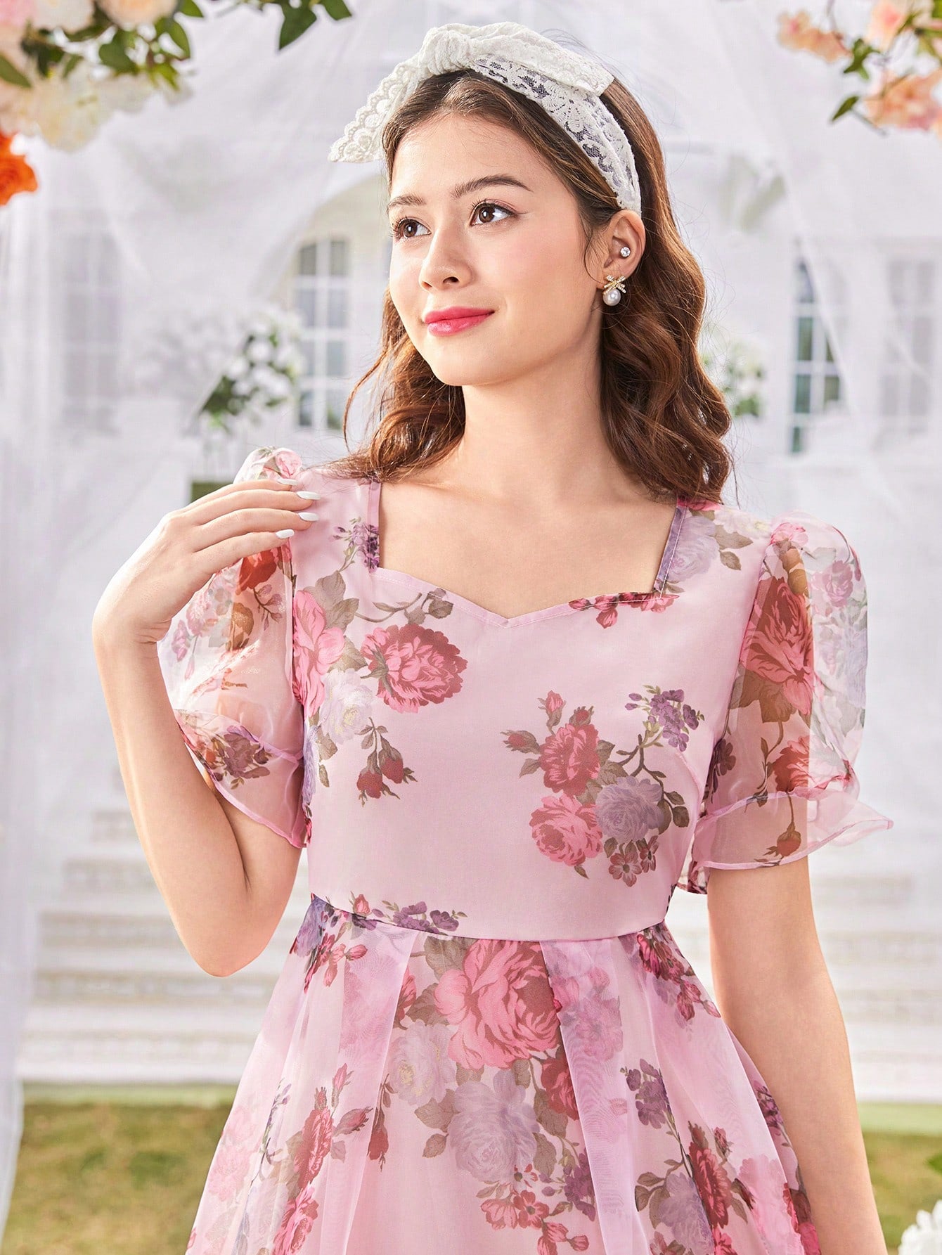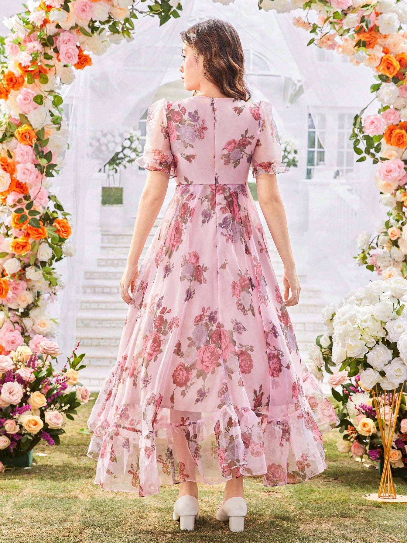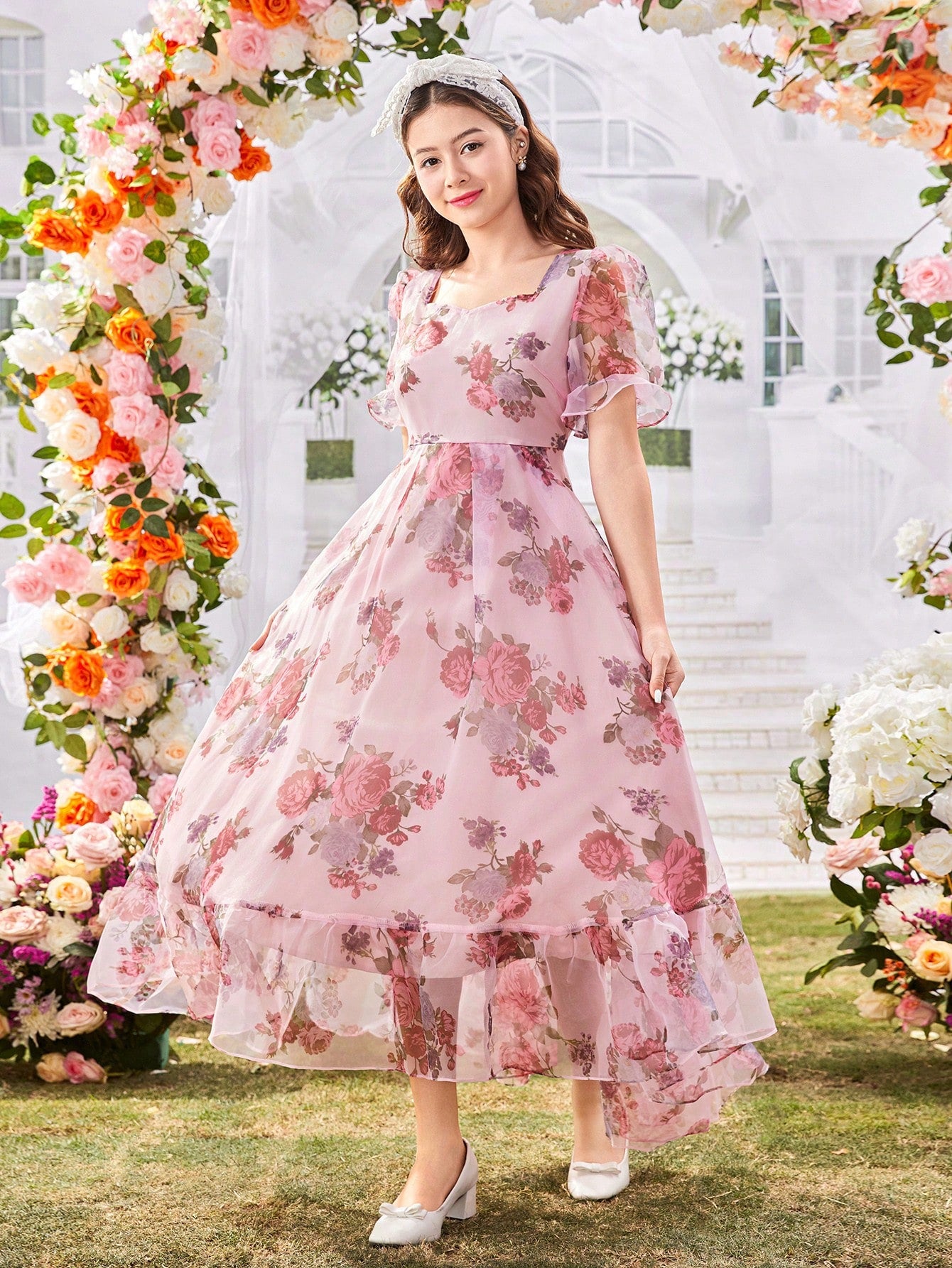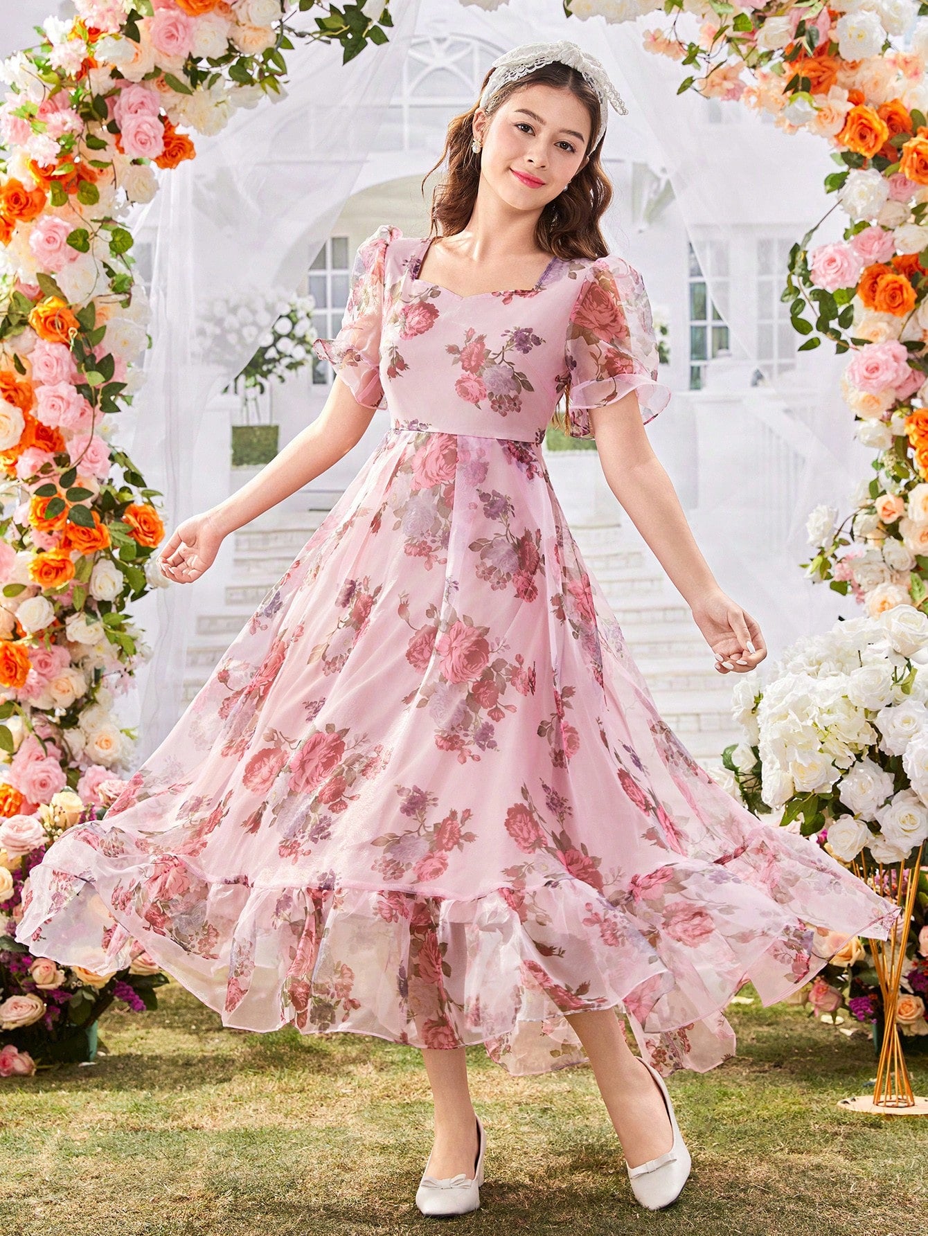El Vestido Floral Elegante para niña es una prenda diseñada para brillar en ocasiones especiales. Con un corte A línea y talle alto, este vestido resalta la silueta con naturalidad, aportando movimiento gracias a su falda larga con volantes en el bajo. El escote redondo y las mangas farol de longitud media añaden un toque romántico, mientras que el tejido de gasa con estampado floral multicolor transmite frescura y alegría.