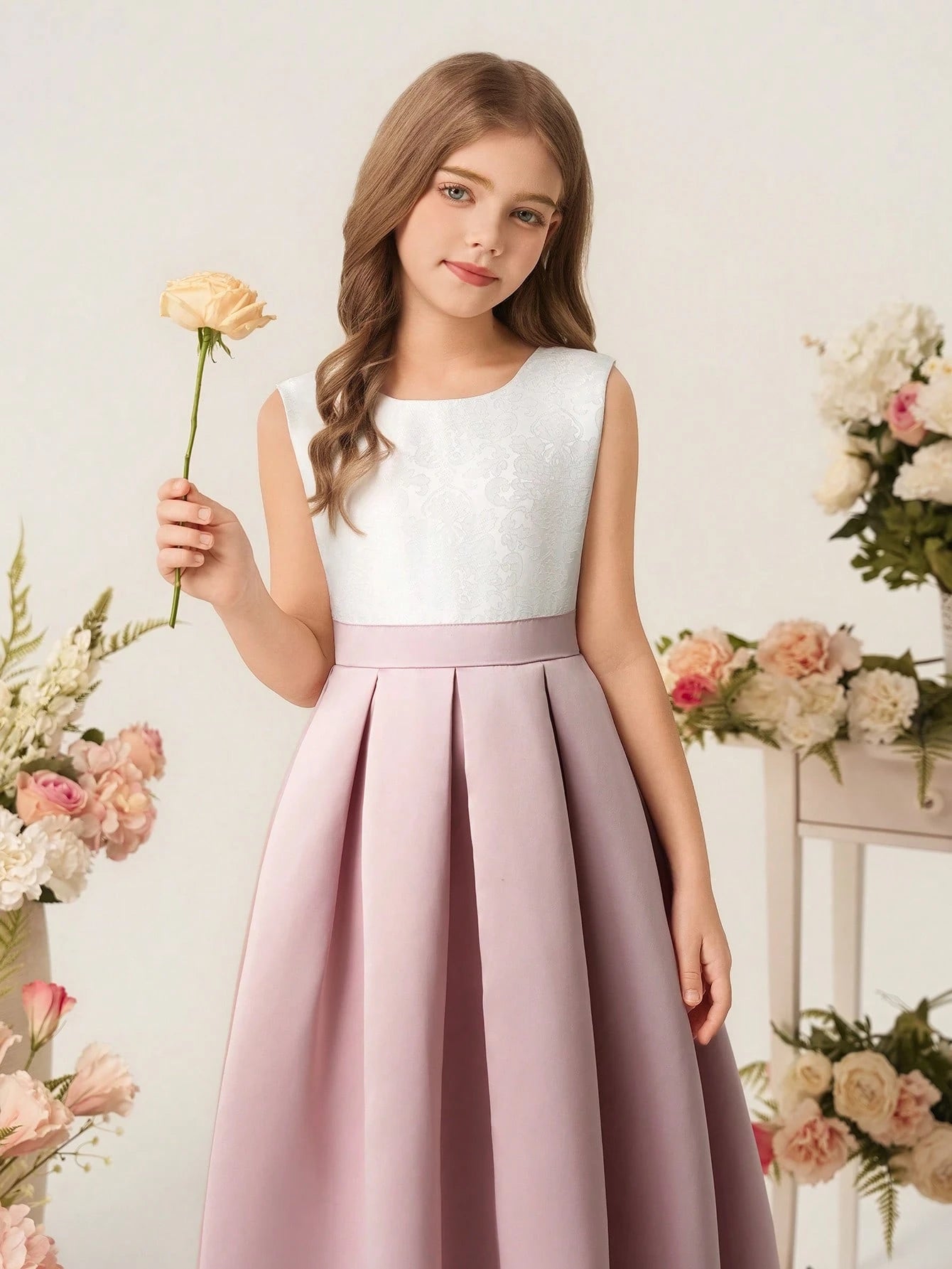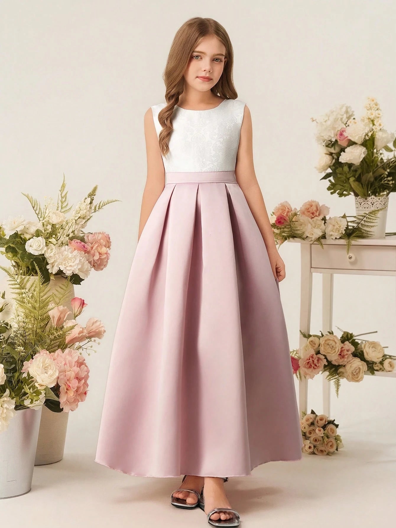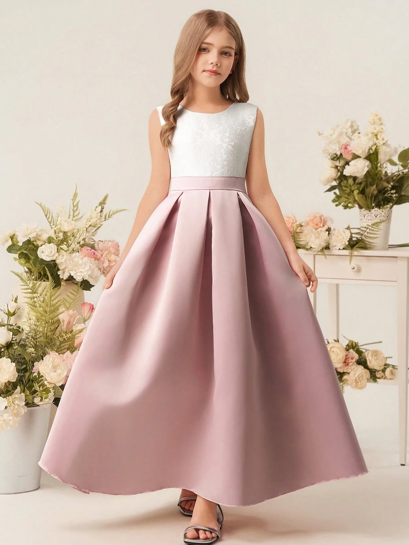 Vestido largo rosa para niña, con cuerpo de encaje blanco, detalles de lentejuelas y falda amplia. Elegante y cómodo, perfecto para fiestas, bodas o eventos especiales.