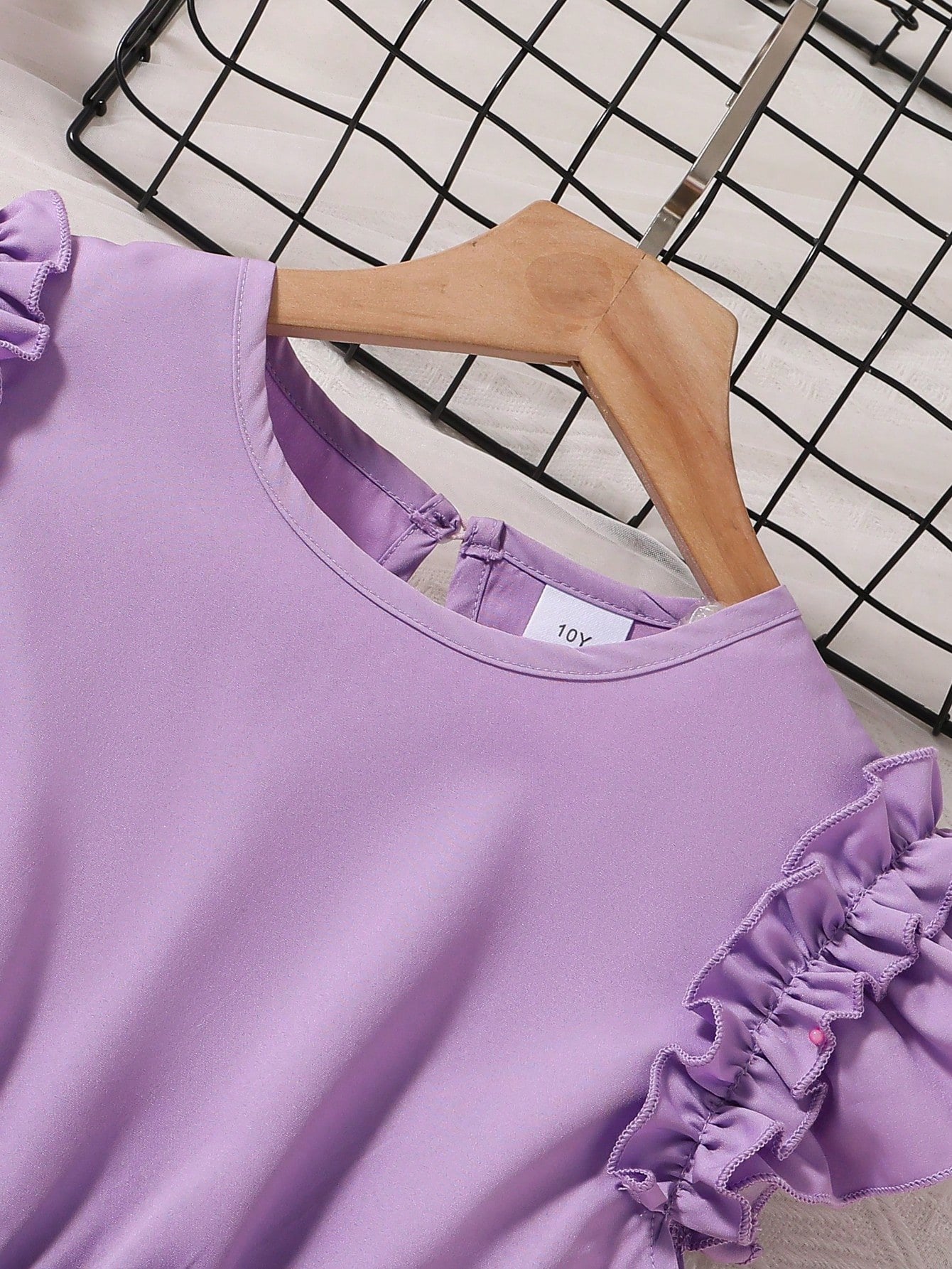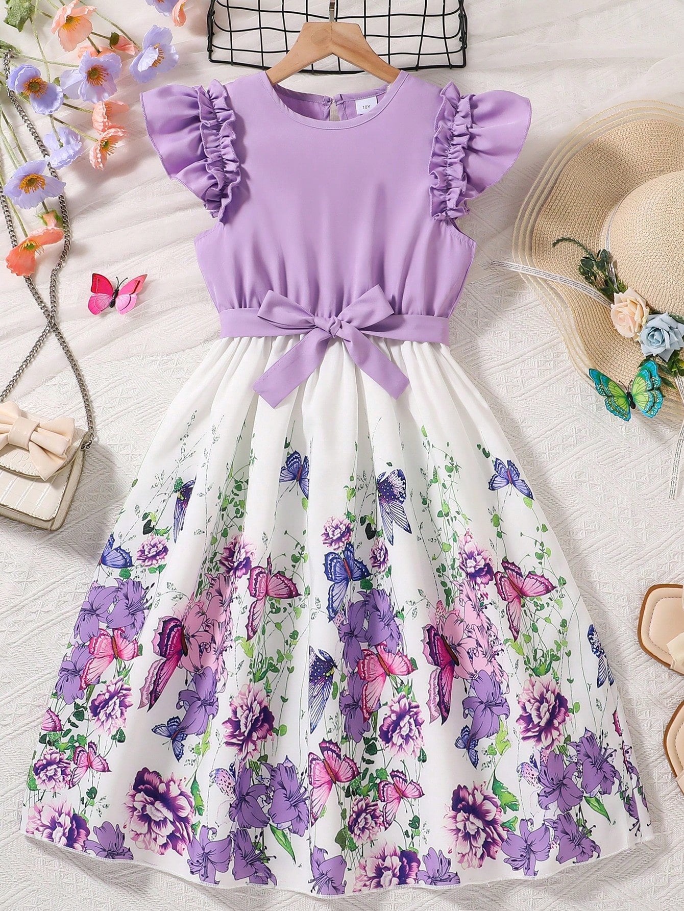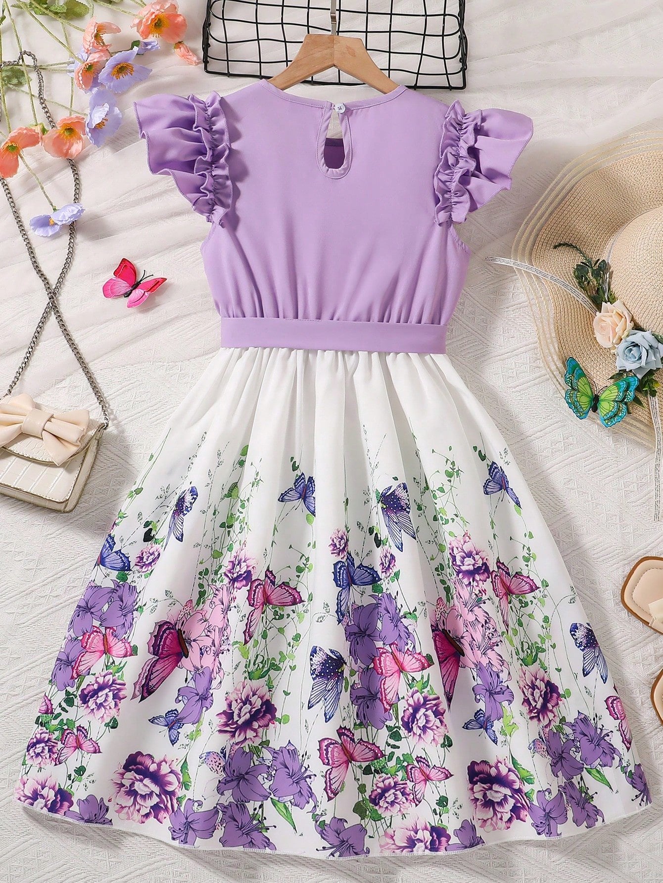 El Vestido Lila Con Volantes Y Falda Floral Para Niña es una prenda pensada para hacerla sentir especial. La parte superior, en un tono lila suave y delicado, cuenta con mangas con volantes dobles que añaden volumen y un toque juguetón. Su escote redondo y la abertura posterior con botón aportan un detalle encantador y práctico.