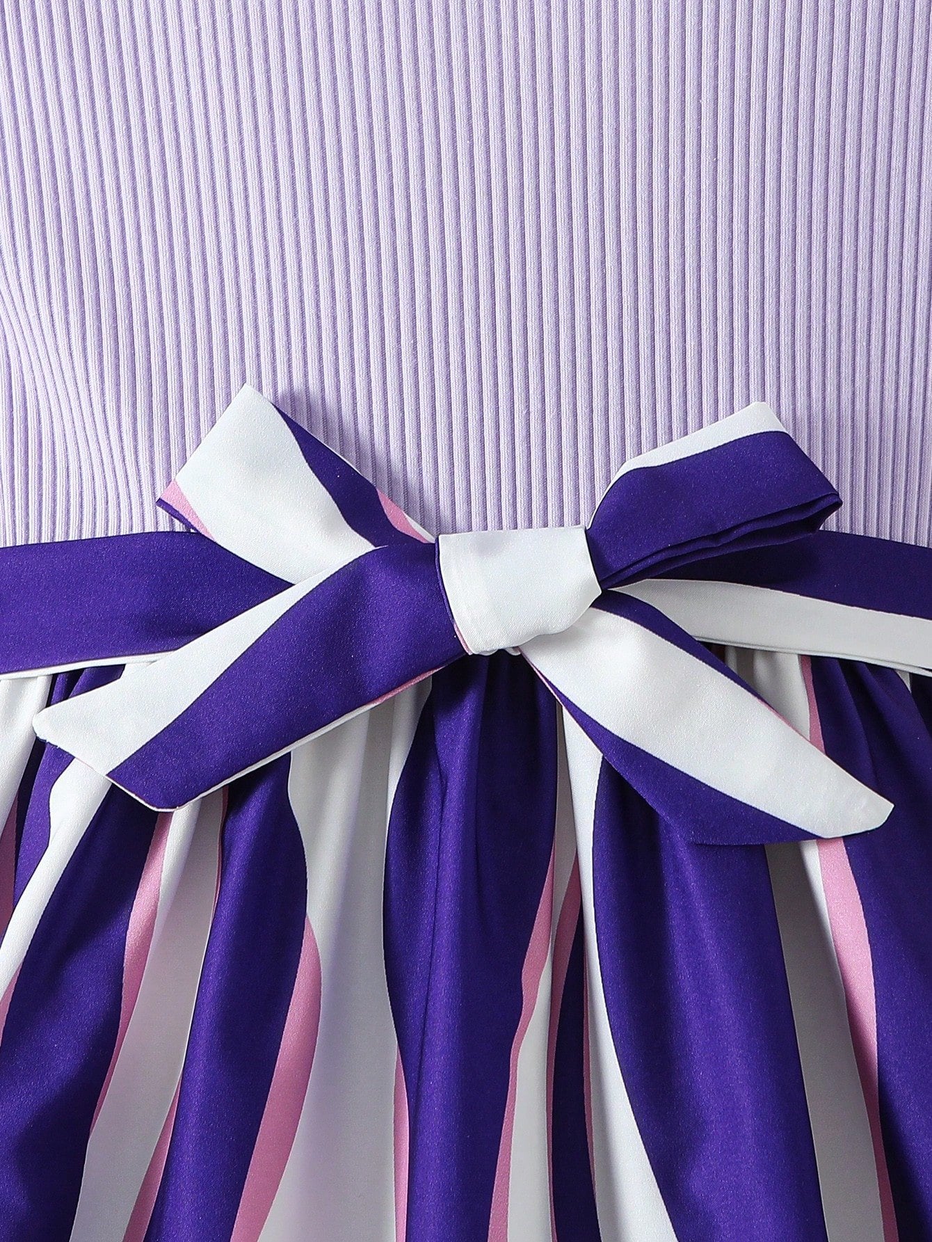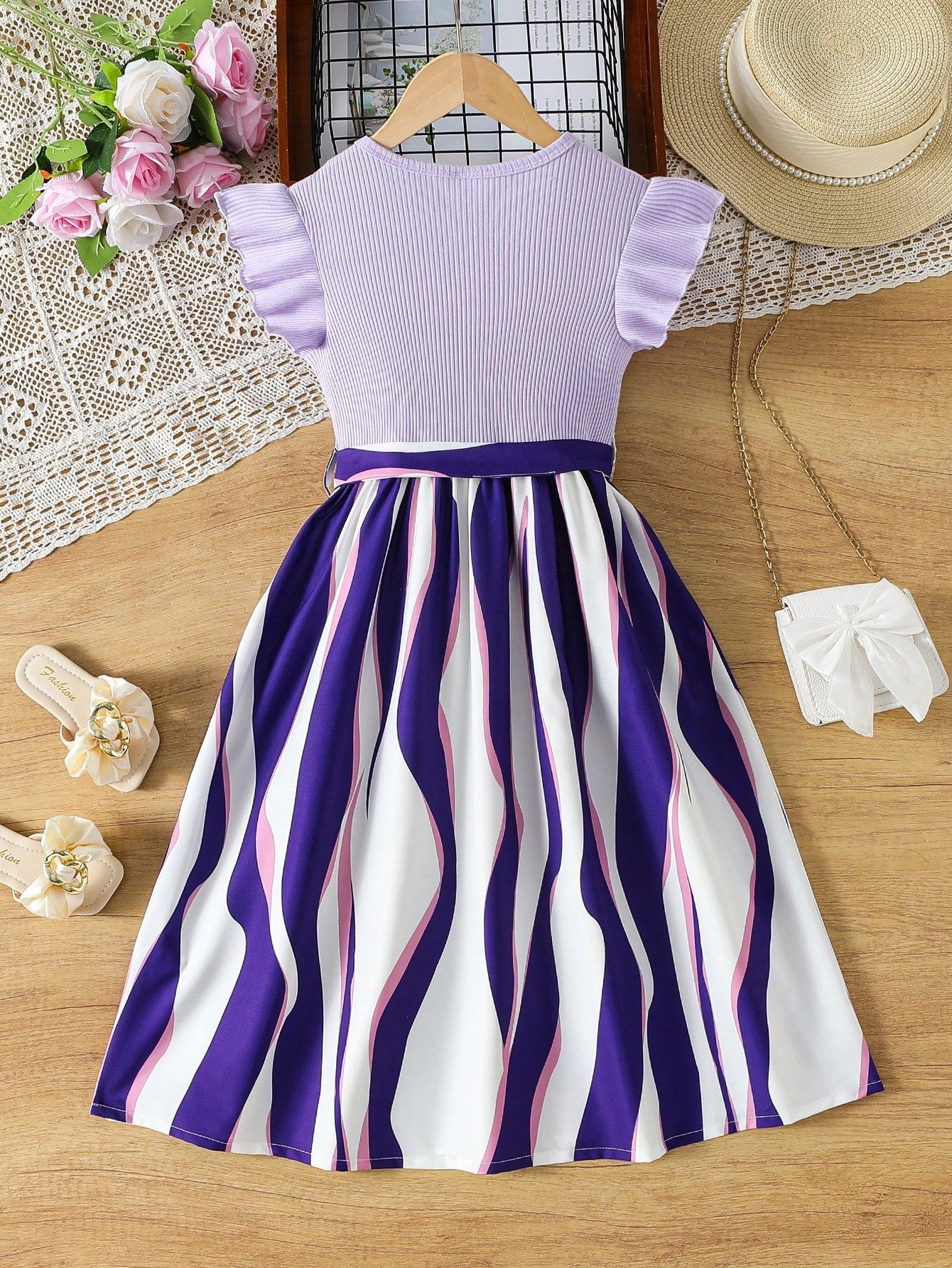 Vestido Morado Con Volantes Y Estampado Geométrico Para Niña