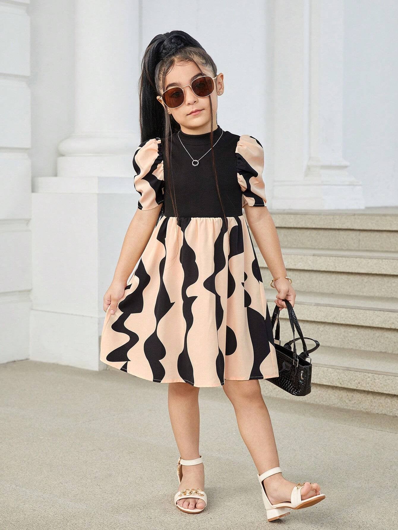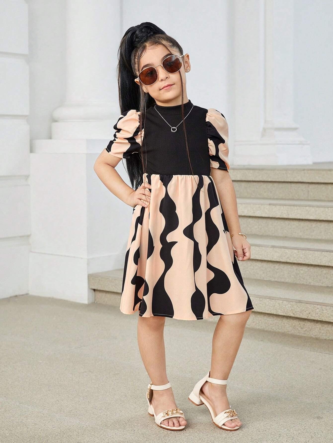 Vestido Negro Con Estampado Gráfico Para Niña Con Manga Farol