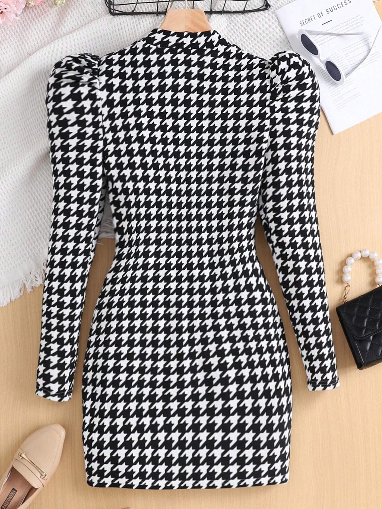 Este vestido pata de gallo blanco y negro para niña adolescente es una opción elegante y moderna, con manga abullonada y diseño entallado para destacar con estilo.