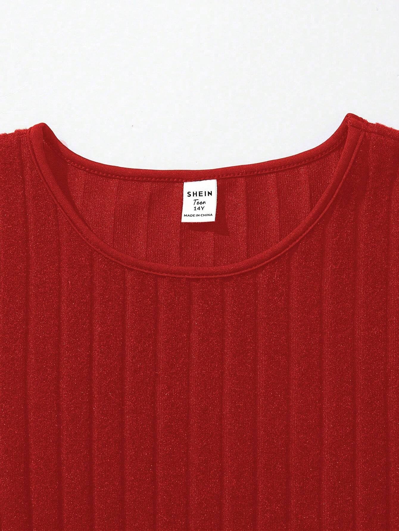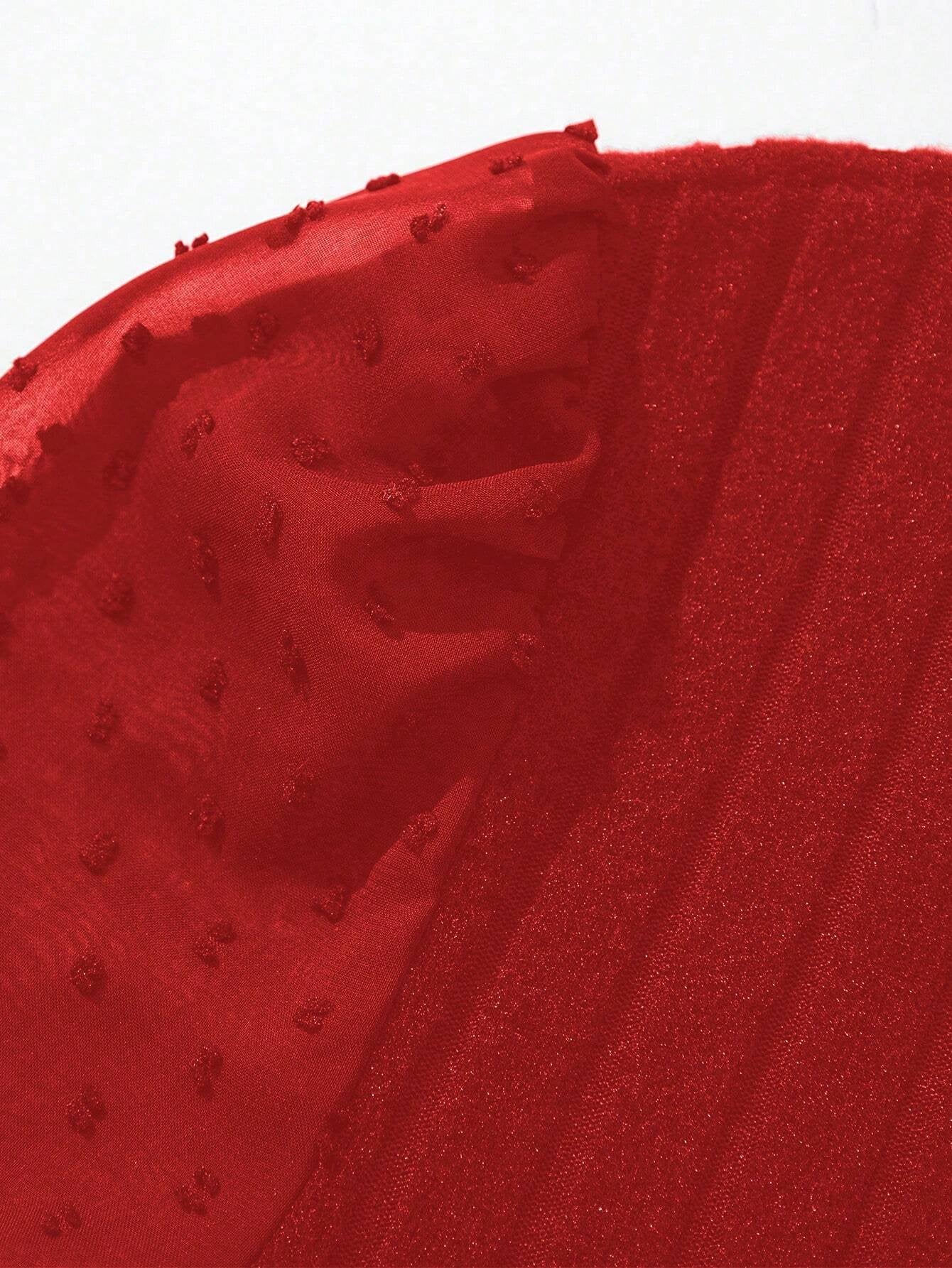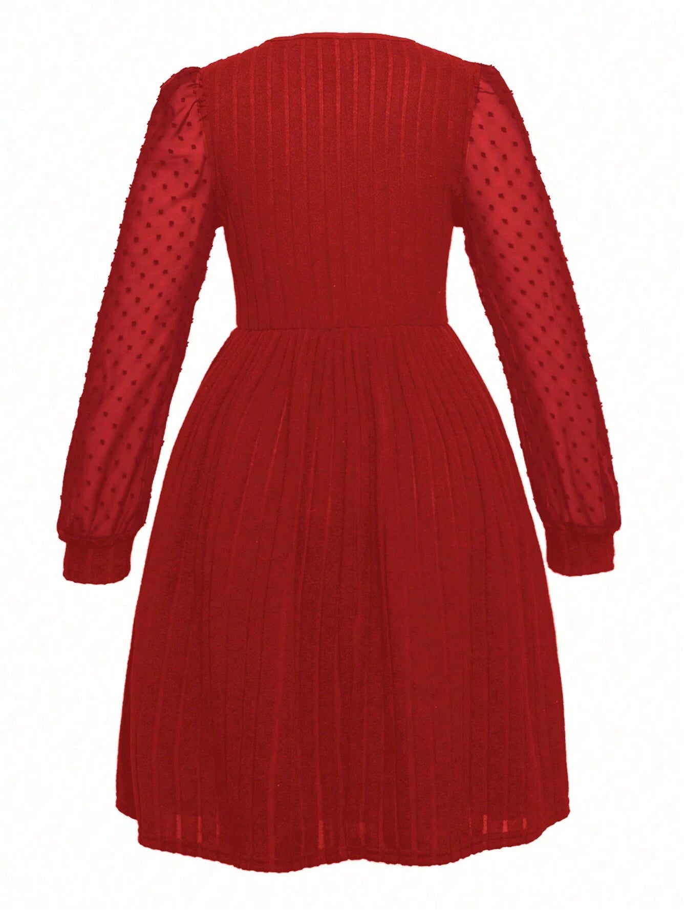 El Vestido Rojo Con Manga Larga De Tul Para Niña es una fusión encantadora de elegancia y estilo moderno. Con un color rojo profundo y vibrante, este vestido presenta un tejido con textura de rayas verticales que estiliza la figura. Las mangas largas de tul plumeti con detalles de puntos delicados aportan un toque romántico y sofisticado, ideal para eventos de temporada o celebraciones elegantes.