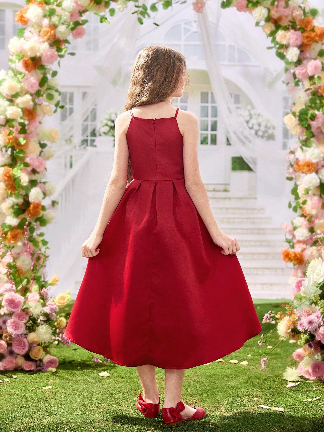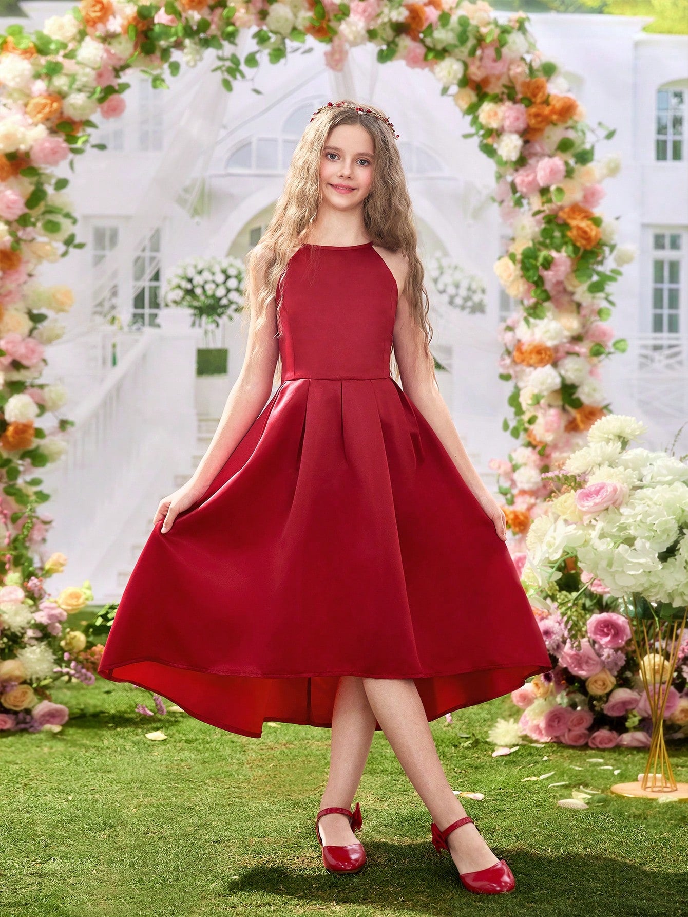 Vestido rojo elegante para niña, con corte A línea y falda amplia. Ideal para eventos especiales, combina comodidad y estilo en un diseño encantador.