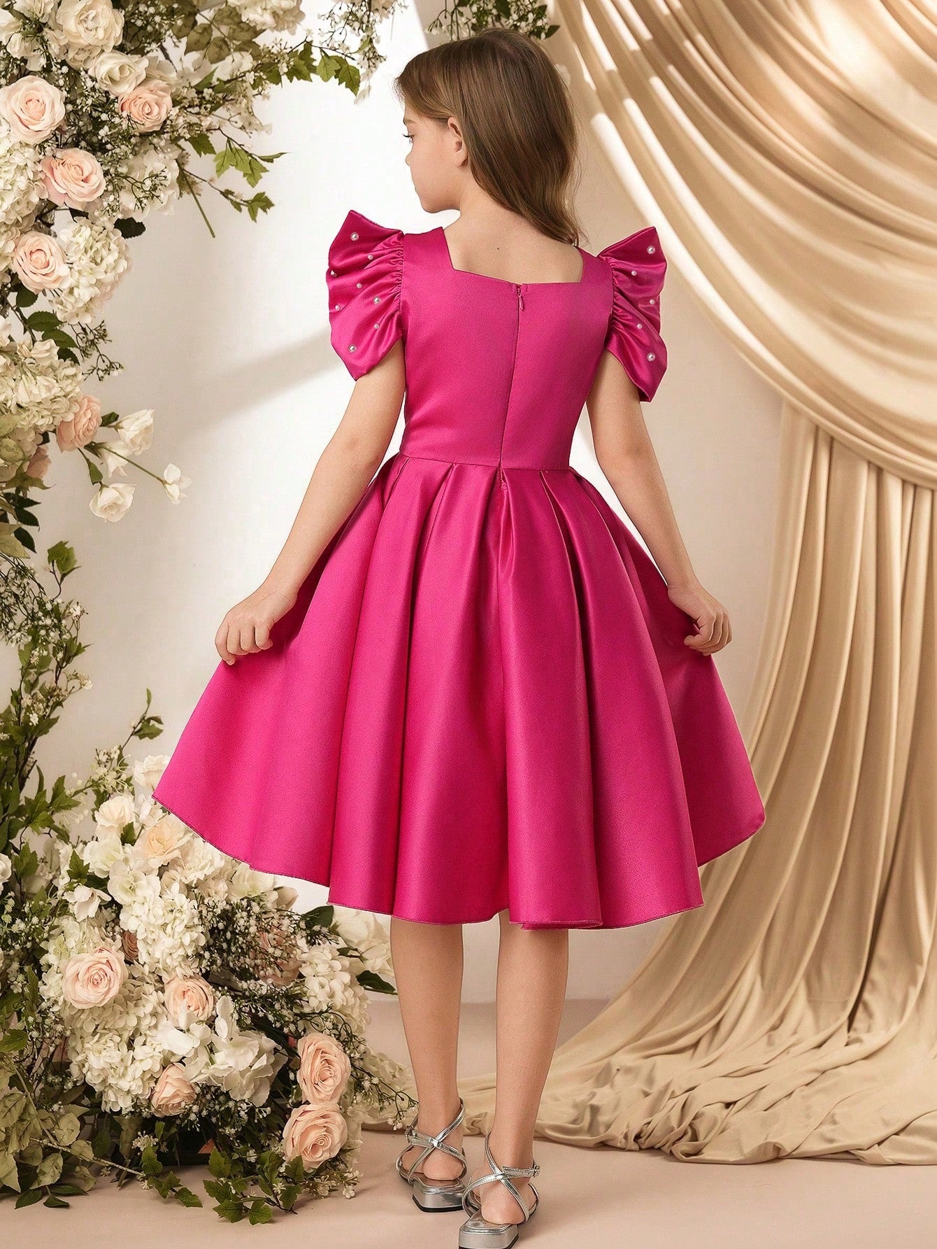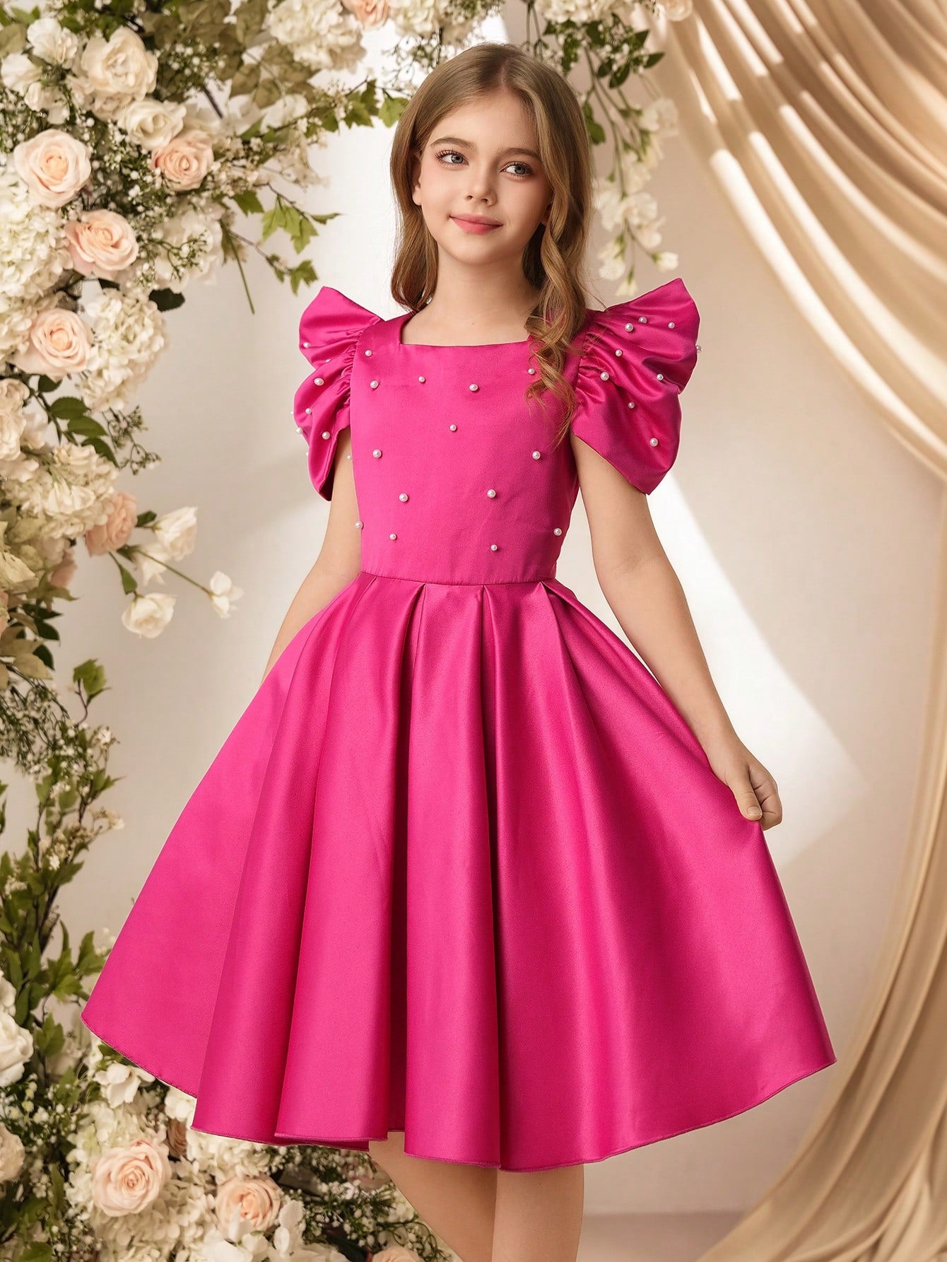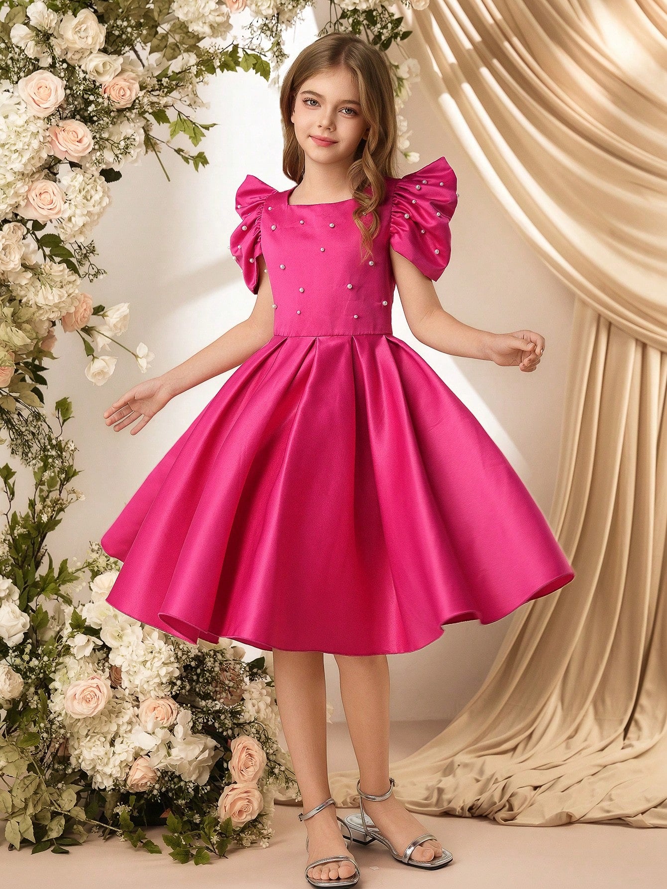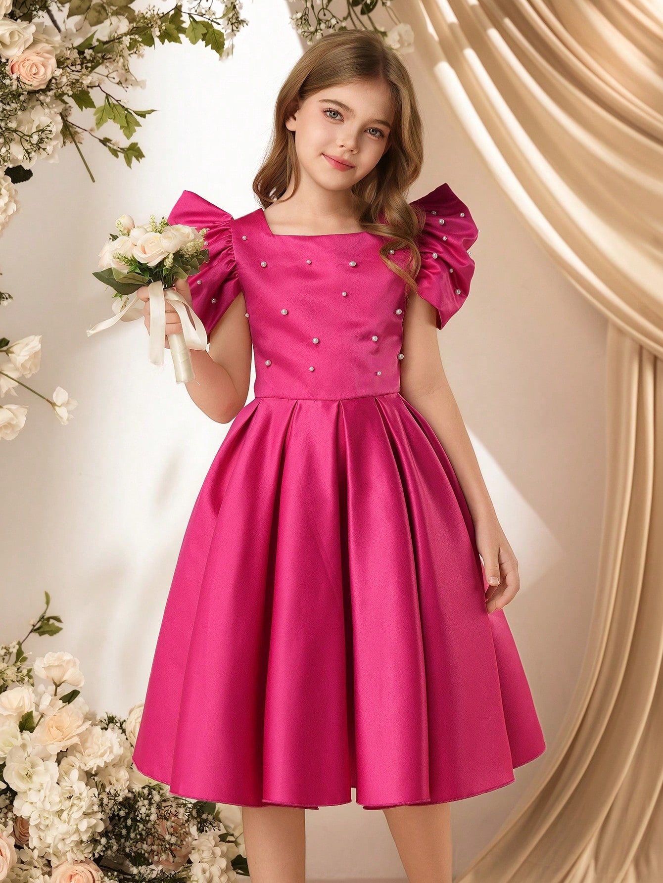 El Vestido Rosa Fucsia Elegante Con Perlas Para Niña es una prenda diseñada para transmitir distinción y dulzura en cada detalle. Su silueta en corte A línea con falda campana aporta volumen y movimiento, creando una caída fluida perfecta para momentos especiales. El escote cuadrado y las mangas con volantes añaden un aire de fantasía, mientras que el delicado detalle de perlas en la parte superior ilumina la prenda con un toque sofisticado y femenino.
