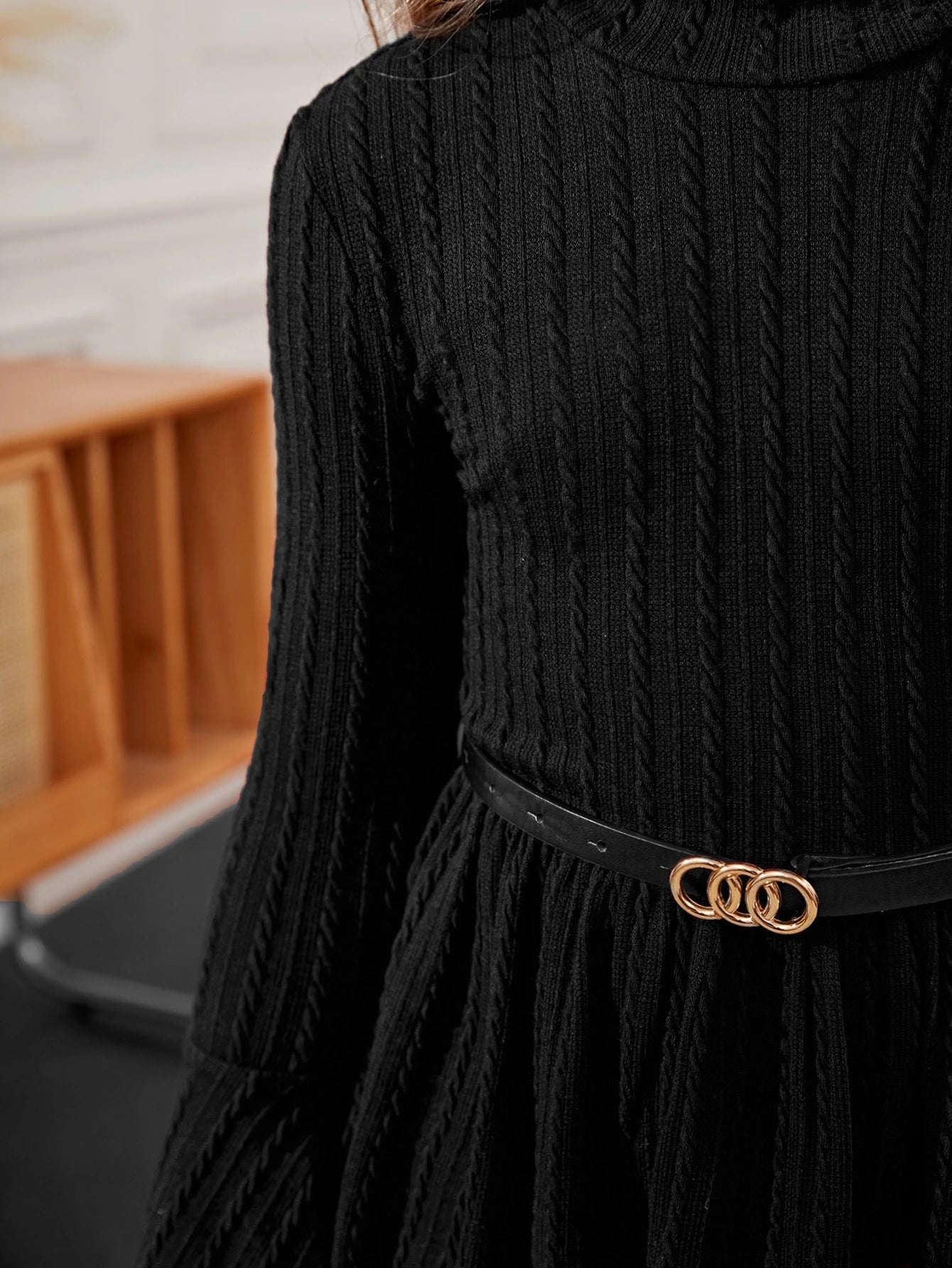 El Vestido Tejido Negro Para Niña es una prenda que combina elegancia con un toque contemporáneo. Su diseño acanalado en tono negro profundo aporta sobriedad y sofisticación, mientras que el cuello alto y las mangas acampanadas crean un look moderno y encantador