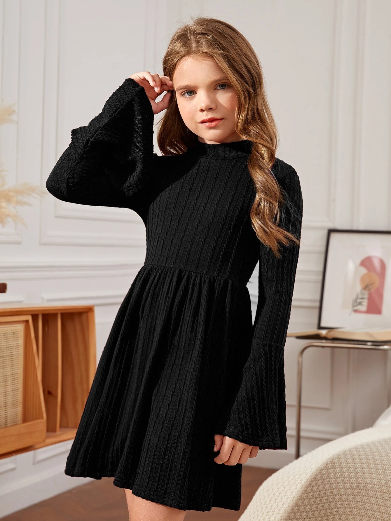 Vestido Tejido Negro Con Manga Acampanada Para Niña